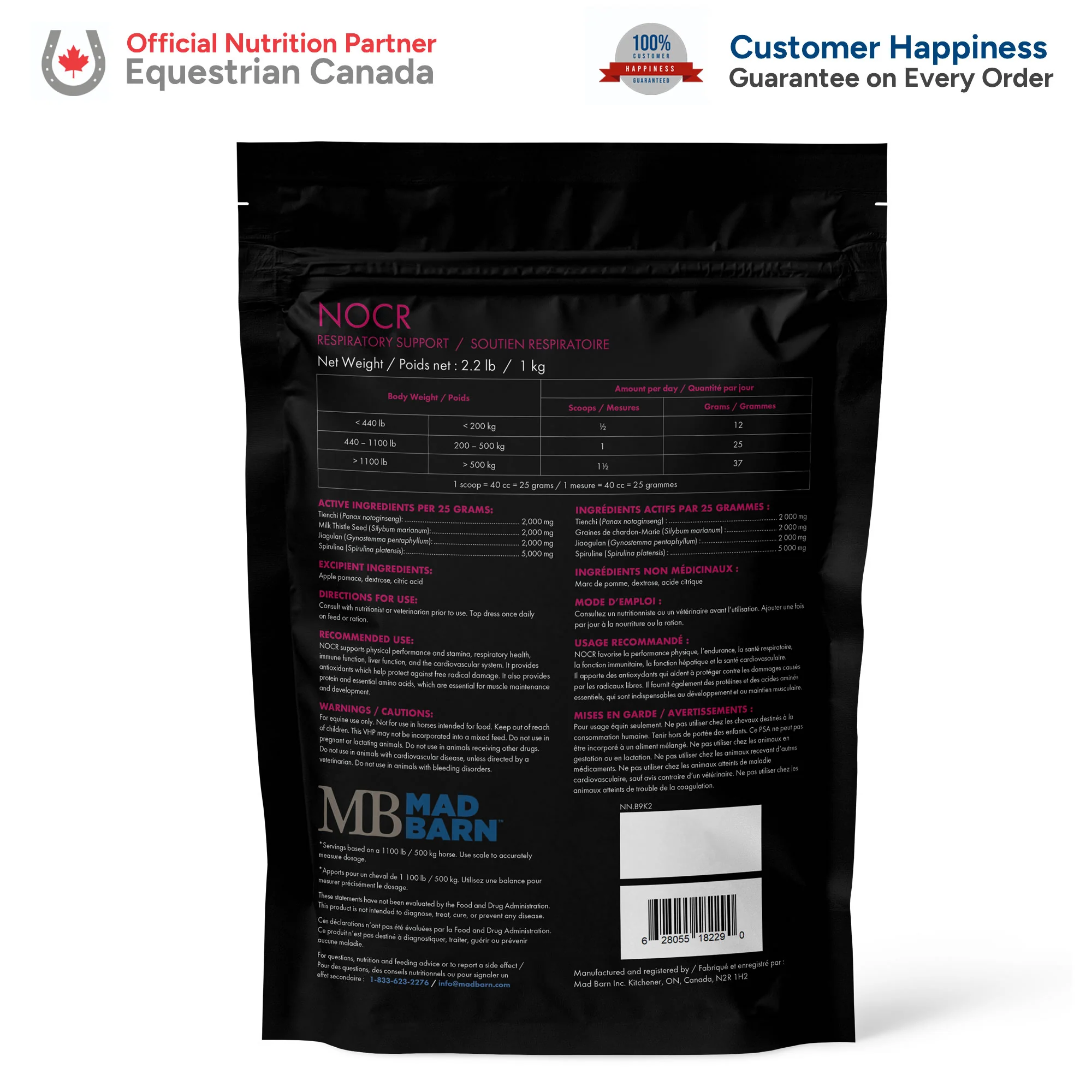 NOCR est un supplément respiratoire 100 % naturel, formulé pour aider les chevaux à mieux respirer et à performer au maximum. Son mélange d’herbes riches en antioxydants soutient la fonction pulmonaire et optimise l’utilisation de l’oxygène, favorisant l’endurance et la performance, tant à l’entraînement qu’en compétition.Bienfaits :Soutient des voies respiratoires et des poumons en santéProtège contre les défis respiratoires saisonniersAppuie la performance physique et la santé cardiovasculaireContribue au bon fonctionnement du système immunitaire et à la santé du foieIdéal pour les chevaux athlétiques ou sensibles aux variations saisonnières.
