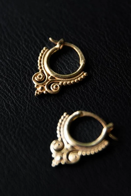 Un monde de subtilités délicates. Ces créoles présentent un anneau en forme de couronne orné d’un motif de perles traditionnel, leur insufflant une touche d’individualité. Ornés de granules complexes, ils témoignent du talent artistique de la granulation.