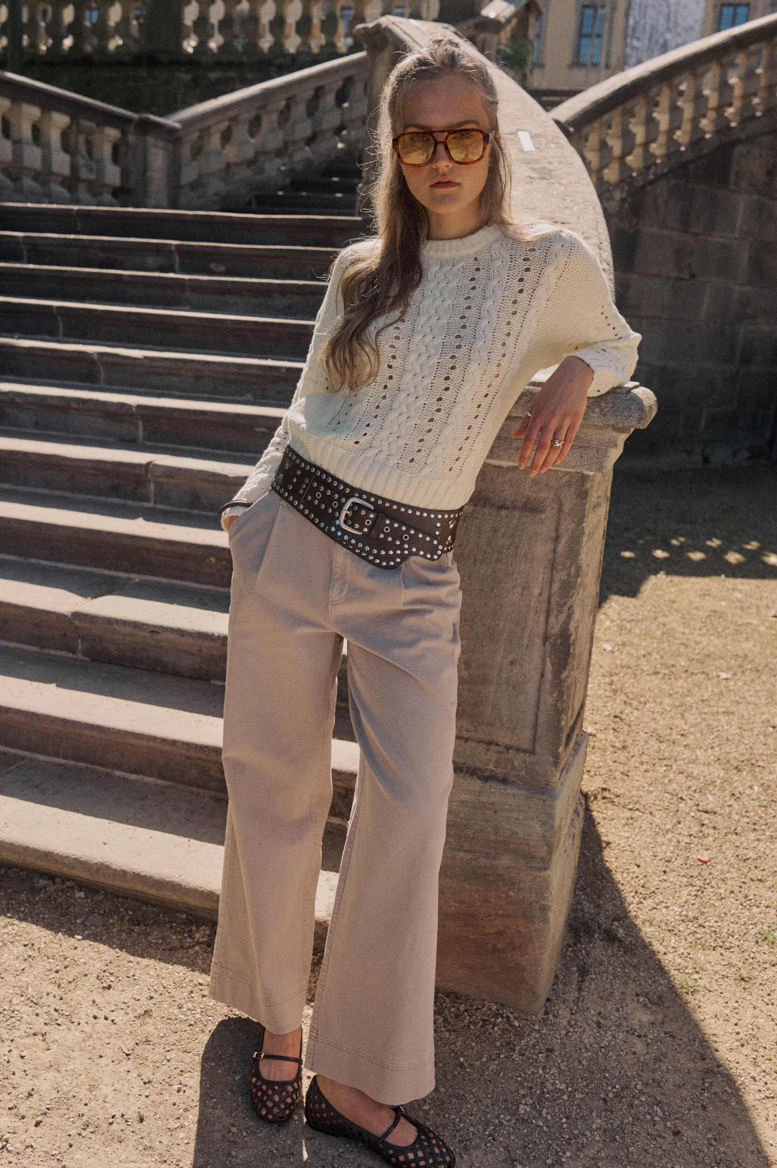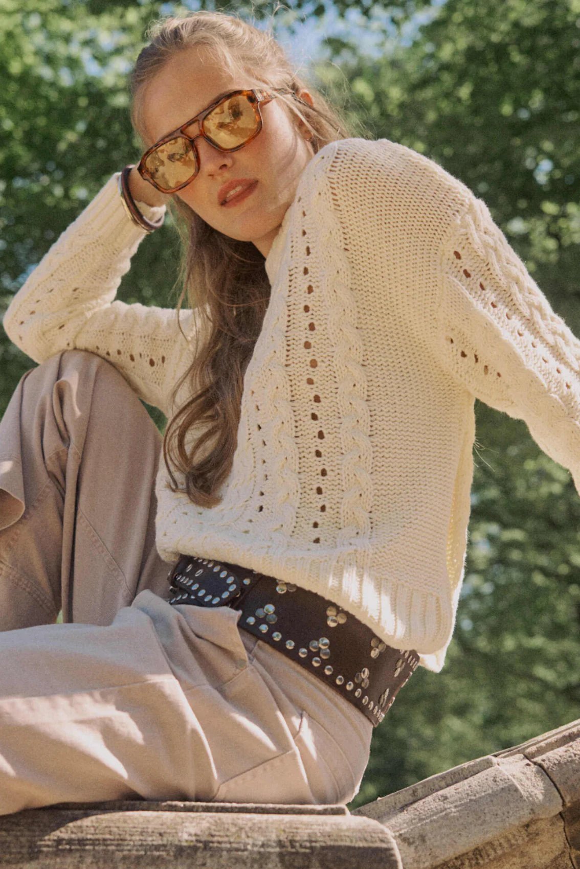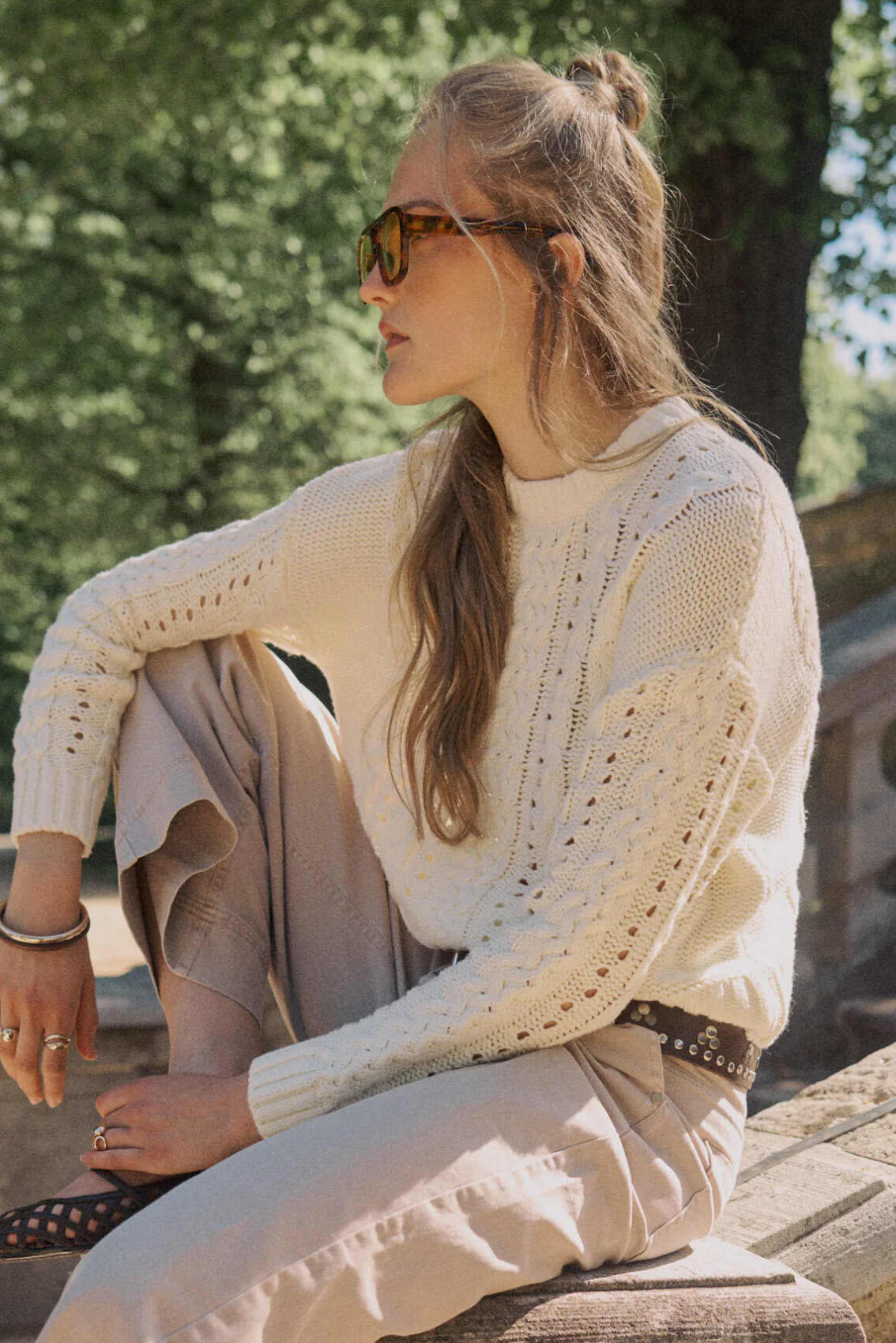 Le NUMPH Pull Nuremi est un pull douillet en mailles avec motif de torsades. Ses manches longues et sa couleur blanc cassé en font une pièce polyvalente et intemporelle. Facile à porter au quotidien, il s’accorde avec presque tout et vous garde au chaud lors des soirées fraîches d’été.