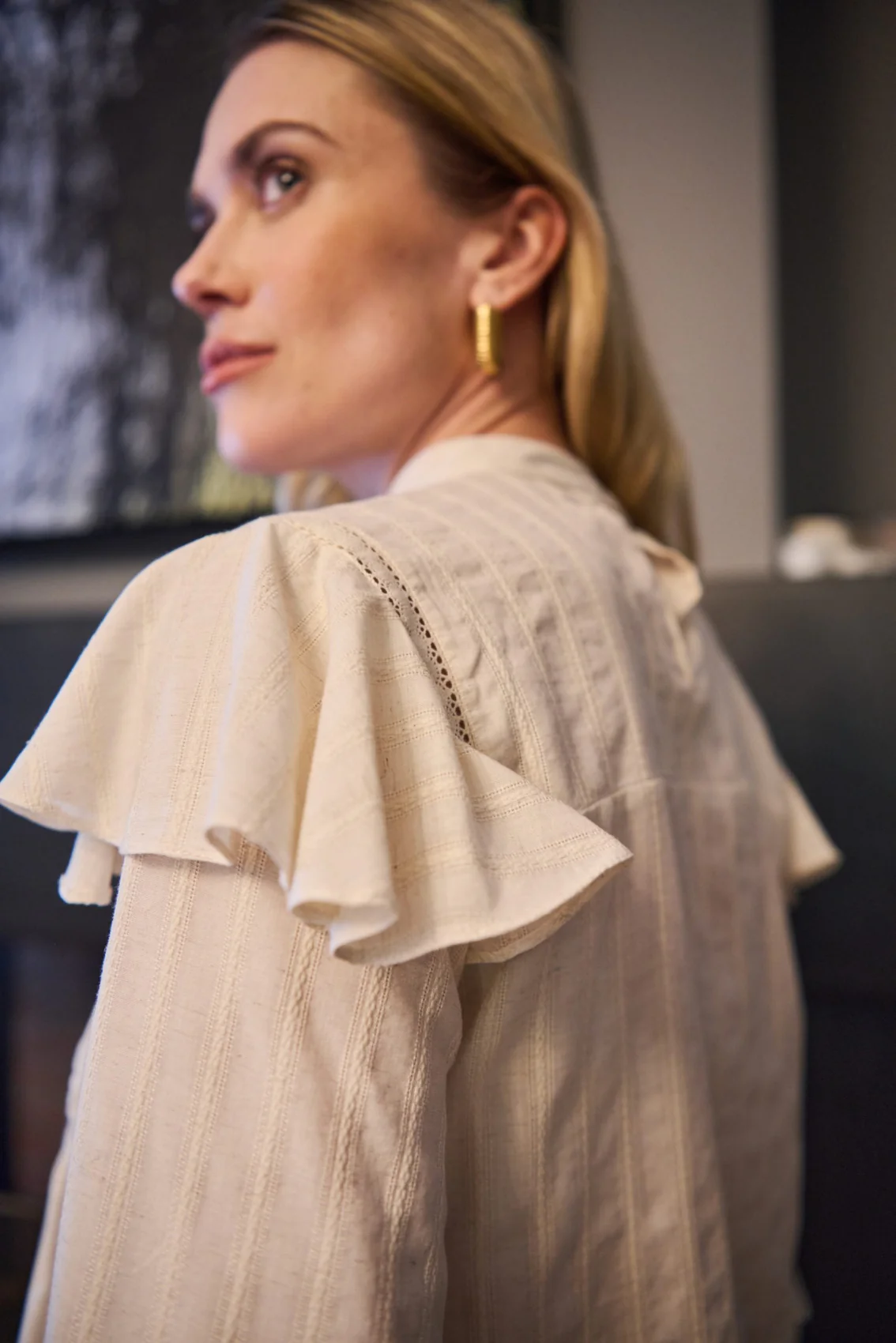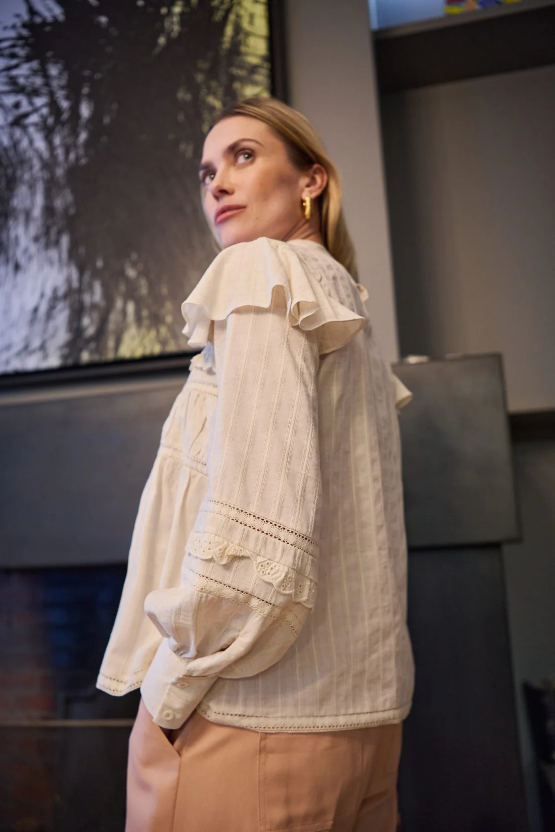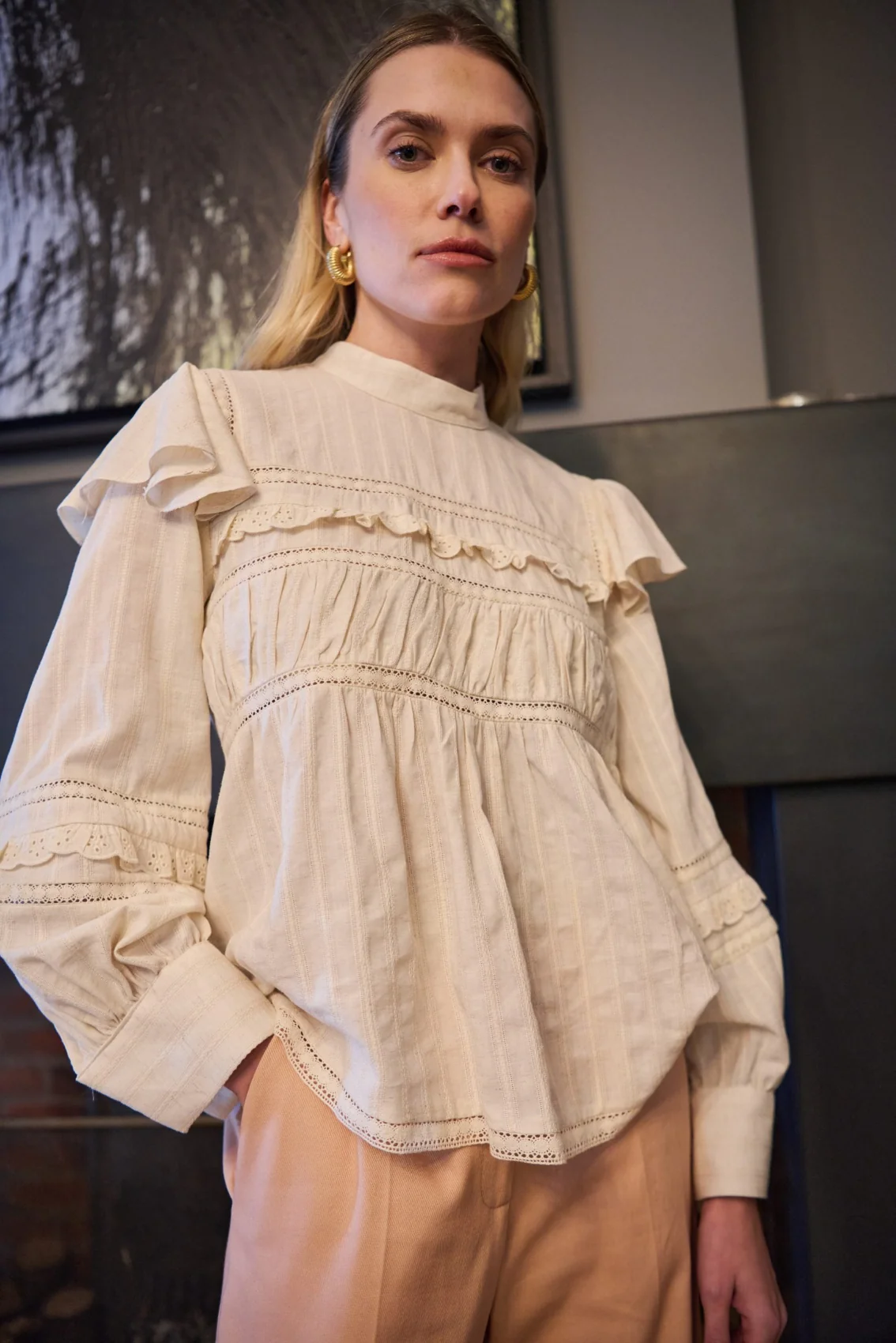 Blouse écru coupe droite Travail de fourniture sur le devant et les manches Col rond montant fermé par un petit bouton au dos Manches longues bouffantes avec petits volants sur les épaules Composition : 100% Coton
