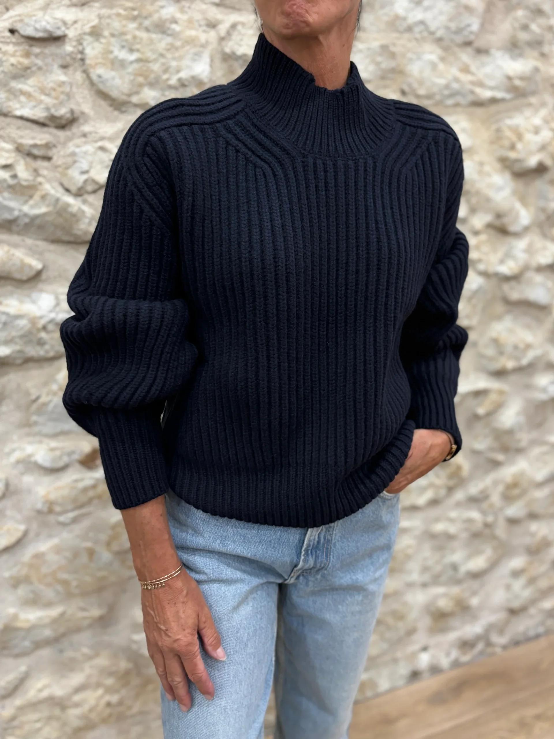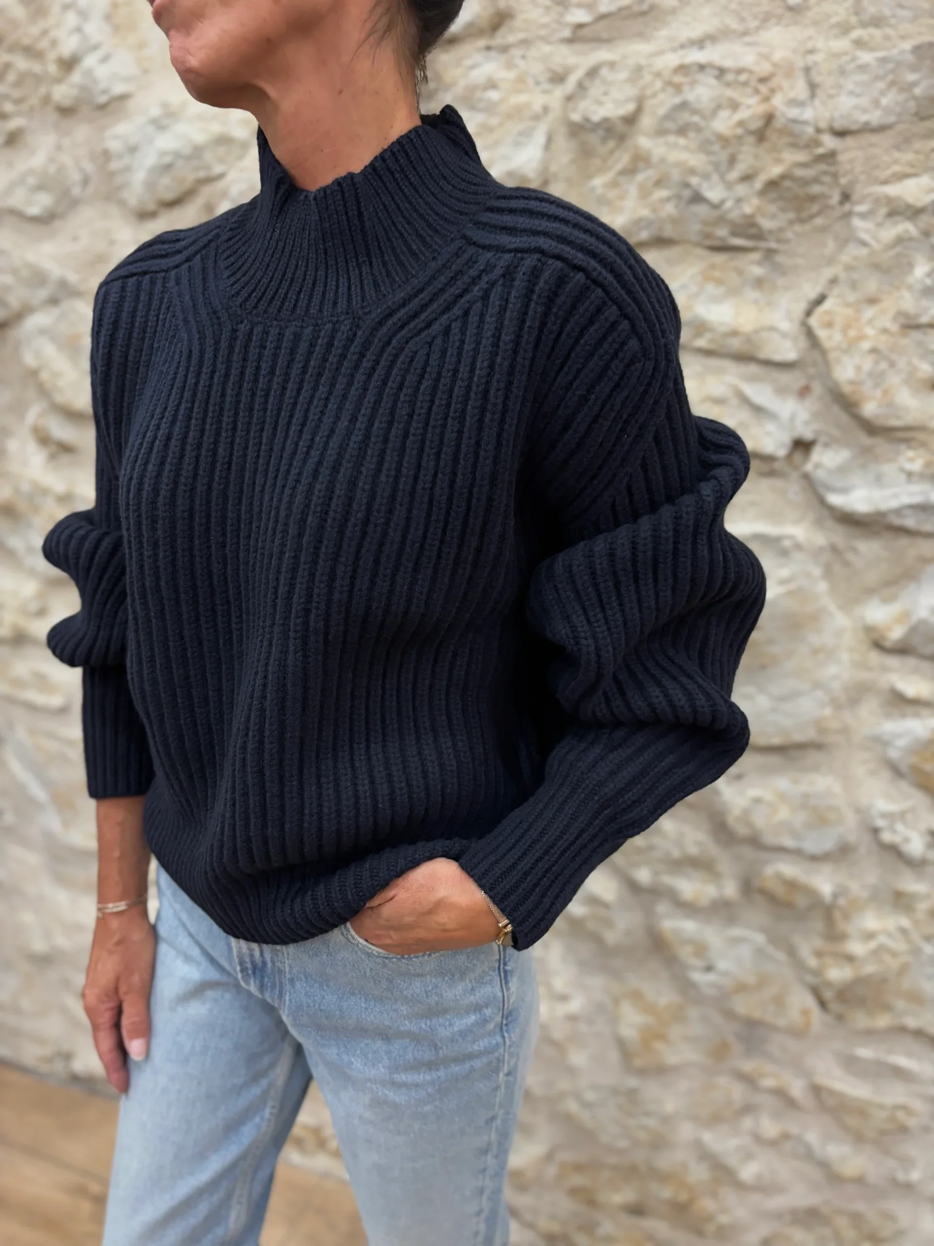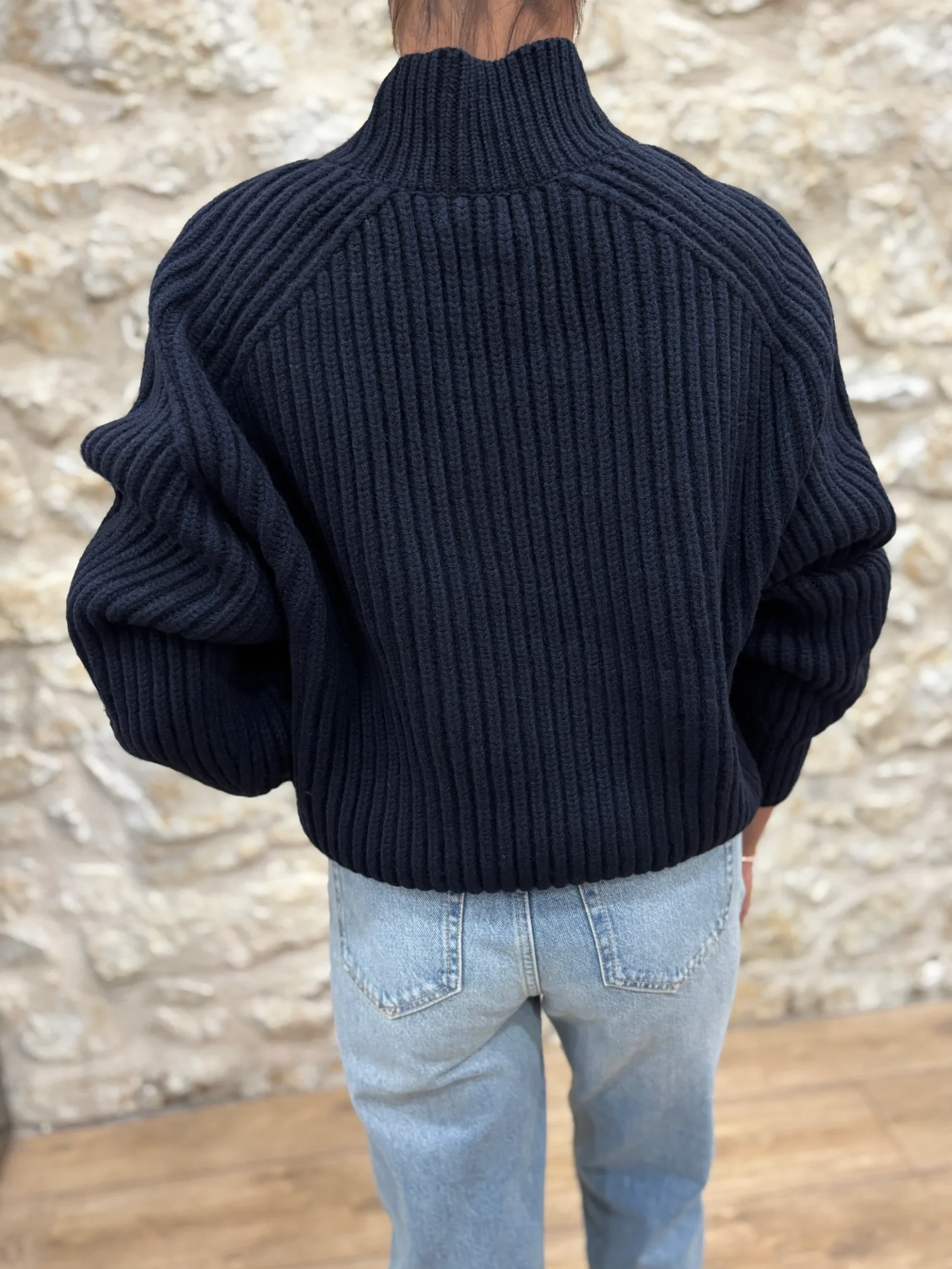 Matières : 100% Laine mérinos Coupe : Coupe oversizeForme du col : Col rond, finition bord côtes.Longueur des manches : Manches longuesCouleurs / Motifs : Bleue marine Notre modèle porte une taille 0 et mesure cm. Nom du modèle : FLAMANDMarque : SOEUR PARIS Conseils d’entretien : Lavage en la main à froid.Informations supplémentaires : […]