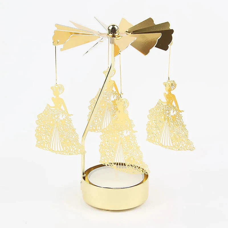 Ce bougeoir rotatif en métal accueille des bougies chauffe-plat standard et diffuse une lumière douce et mouvante lors des réceptions. Le cadre en fer assure stabilité et durabilité, et le mécanisme de rotation lente projette des reflets subtils sur les surfaces environnantes, ajoutant une atmosphère chaleureuse sans encombrer la table.