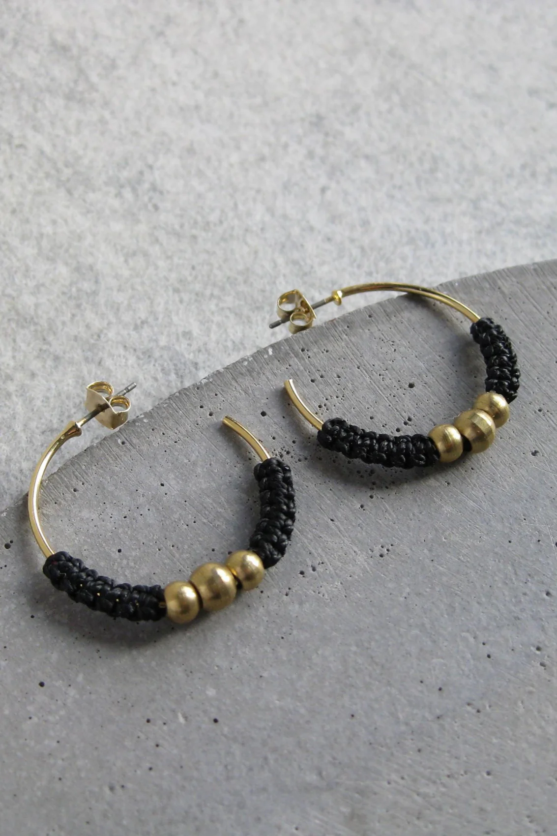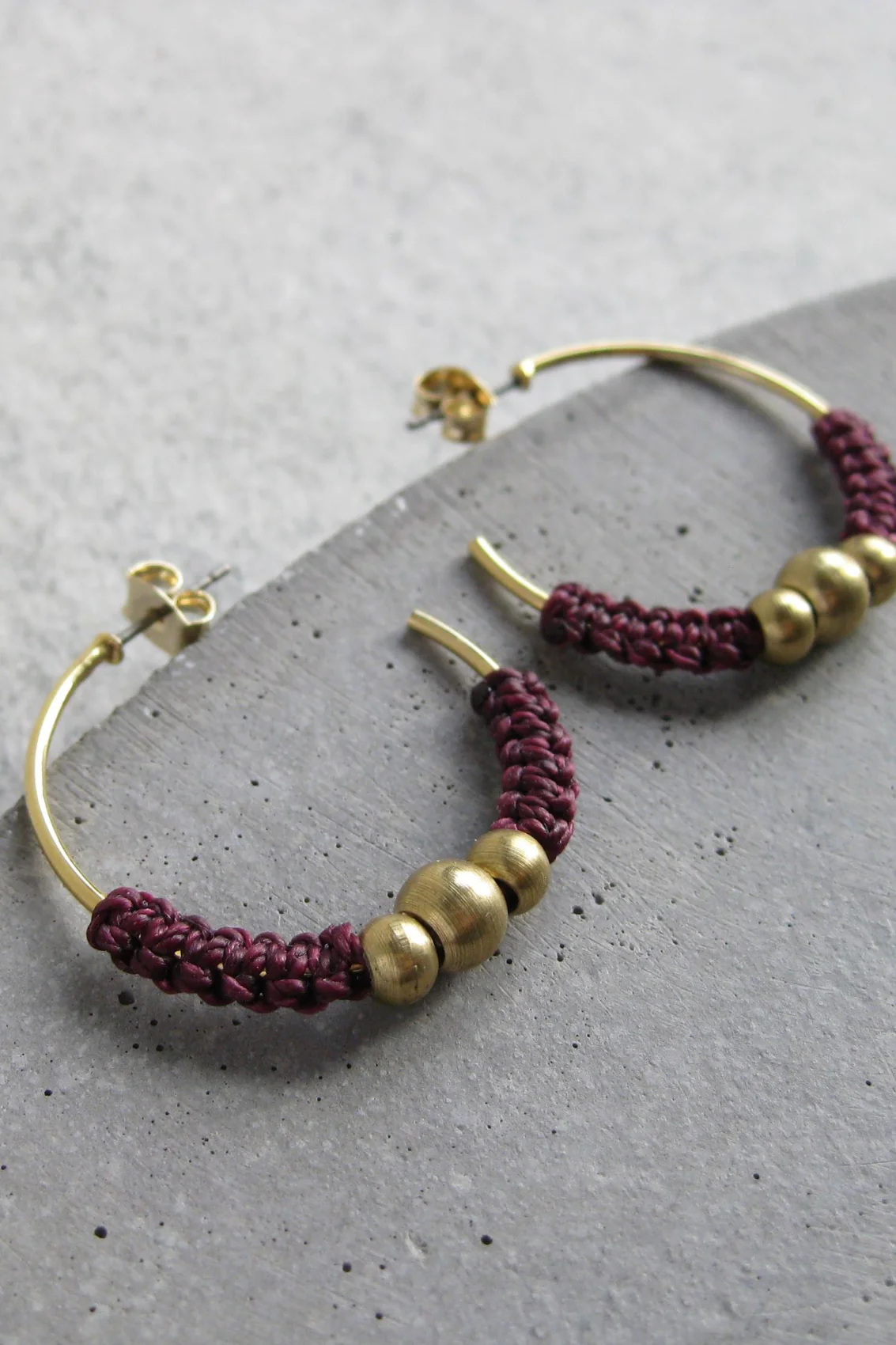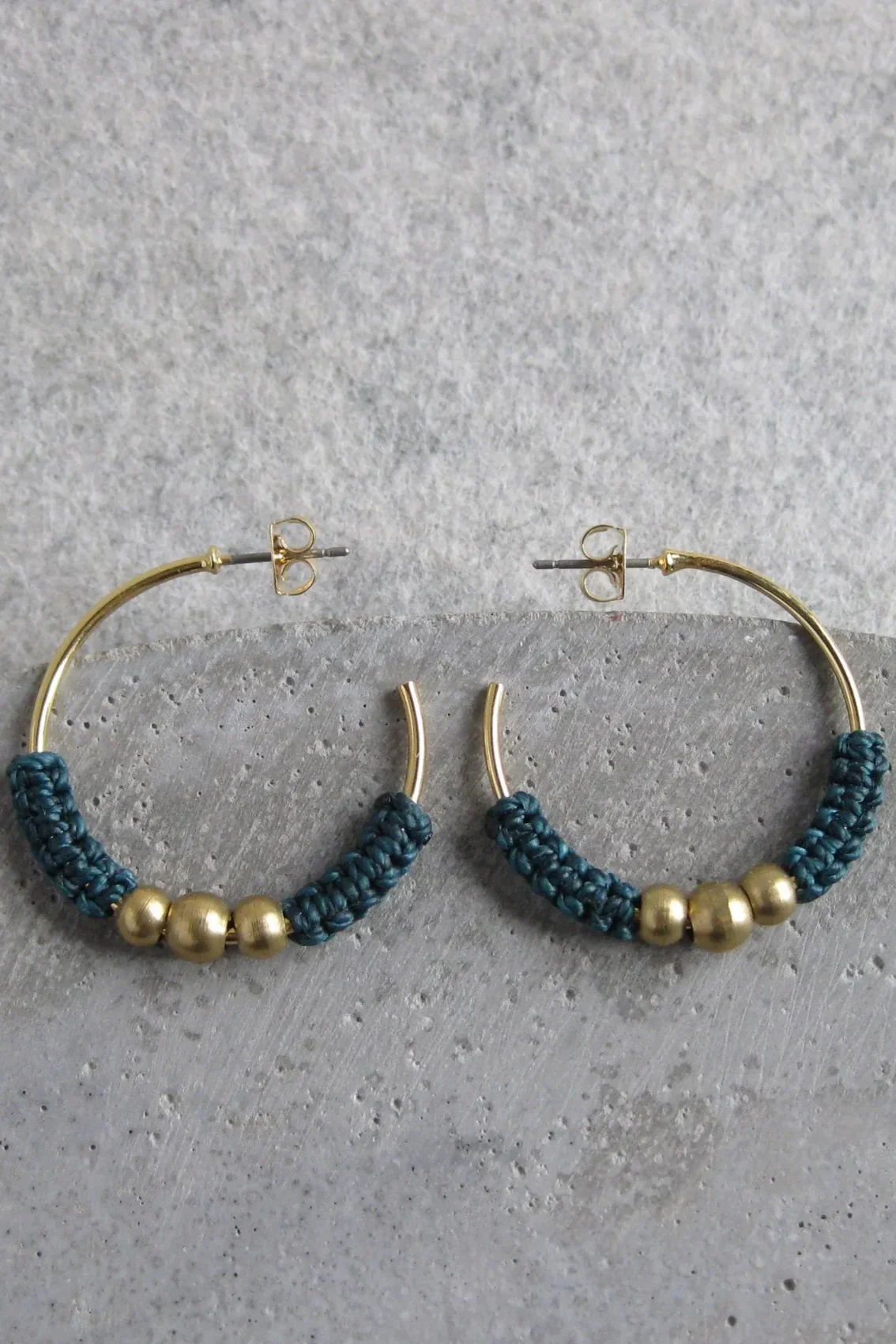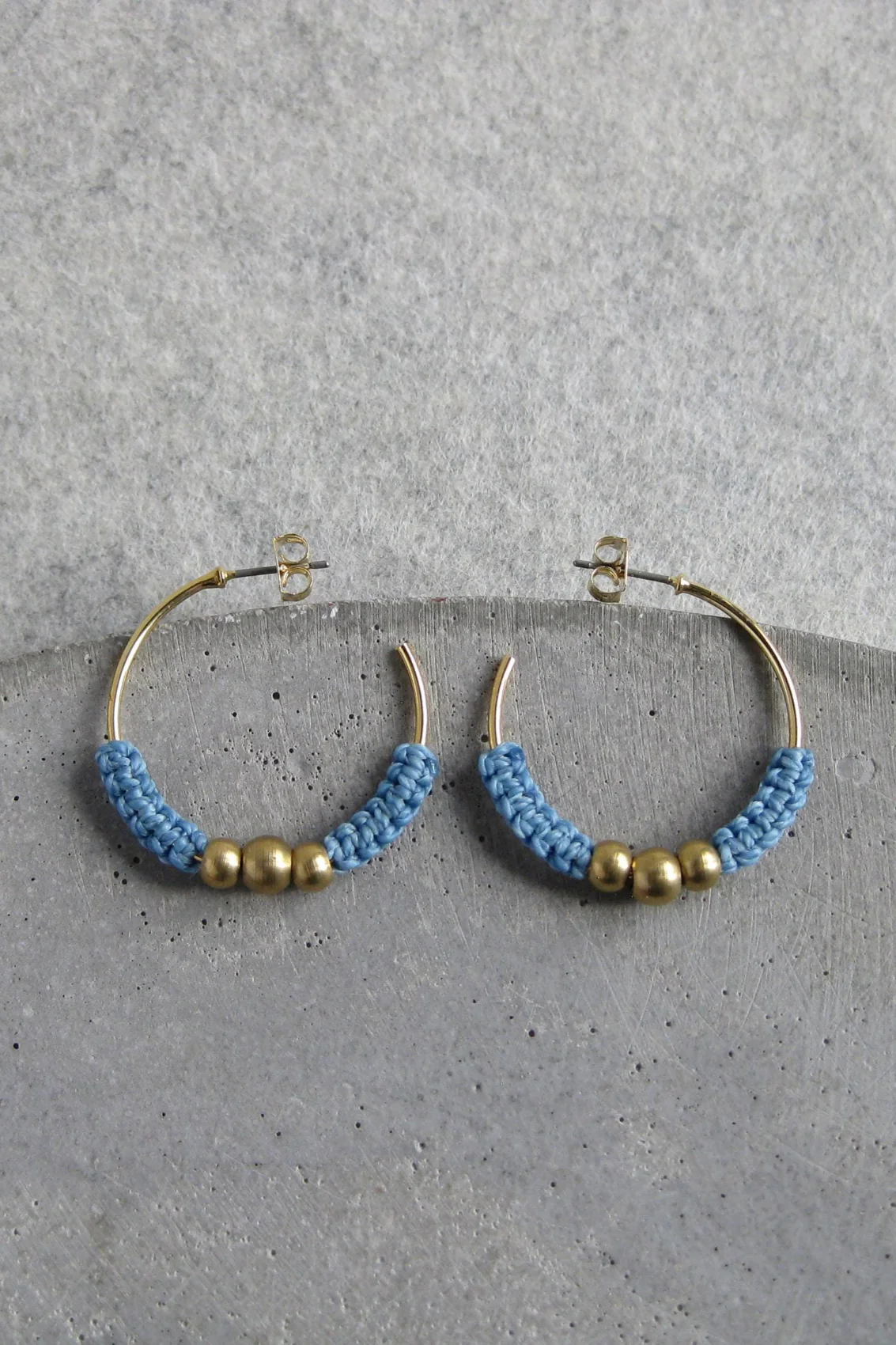 Anneaux d’oreilles présentant un joli détail minimaliste en micro-macramé de couleur bleu jeans, orné de 3 volumineuses billes en laiton. Les boucles d’oreilles Isis combinent subtilement charme exotique et élégance contemporaine.