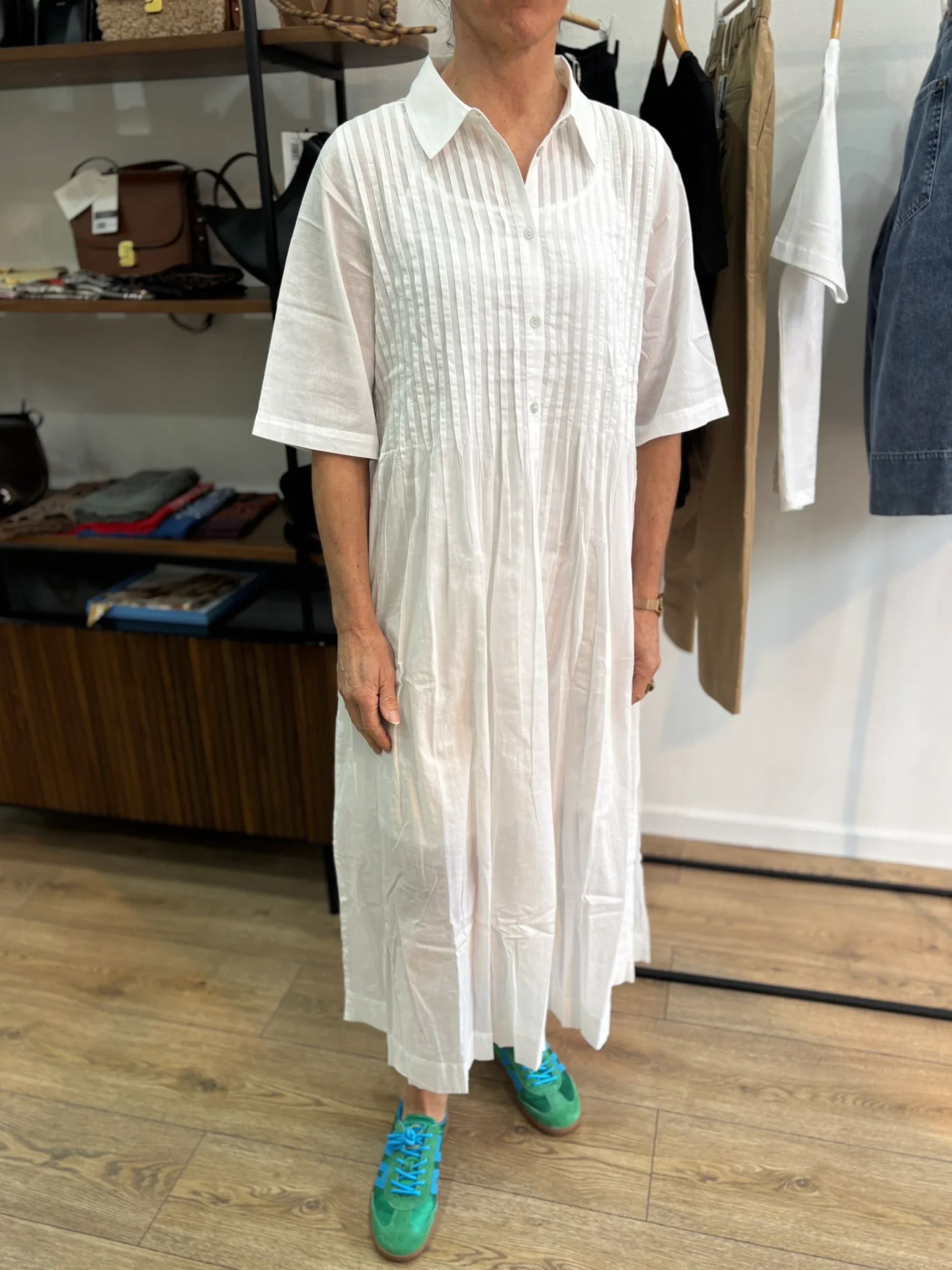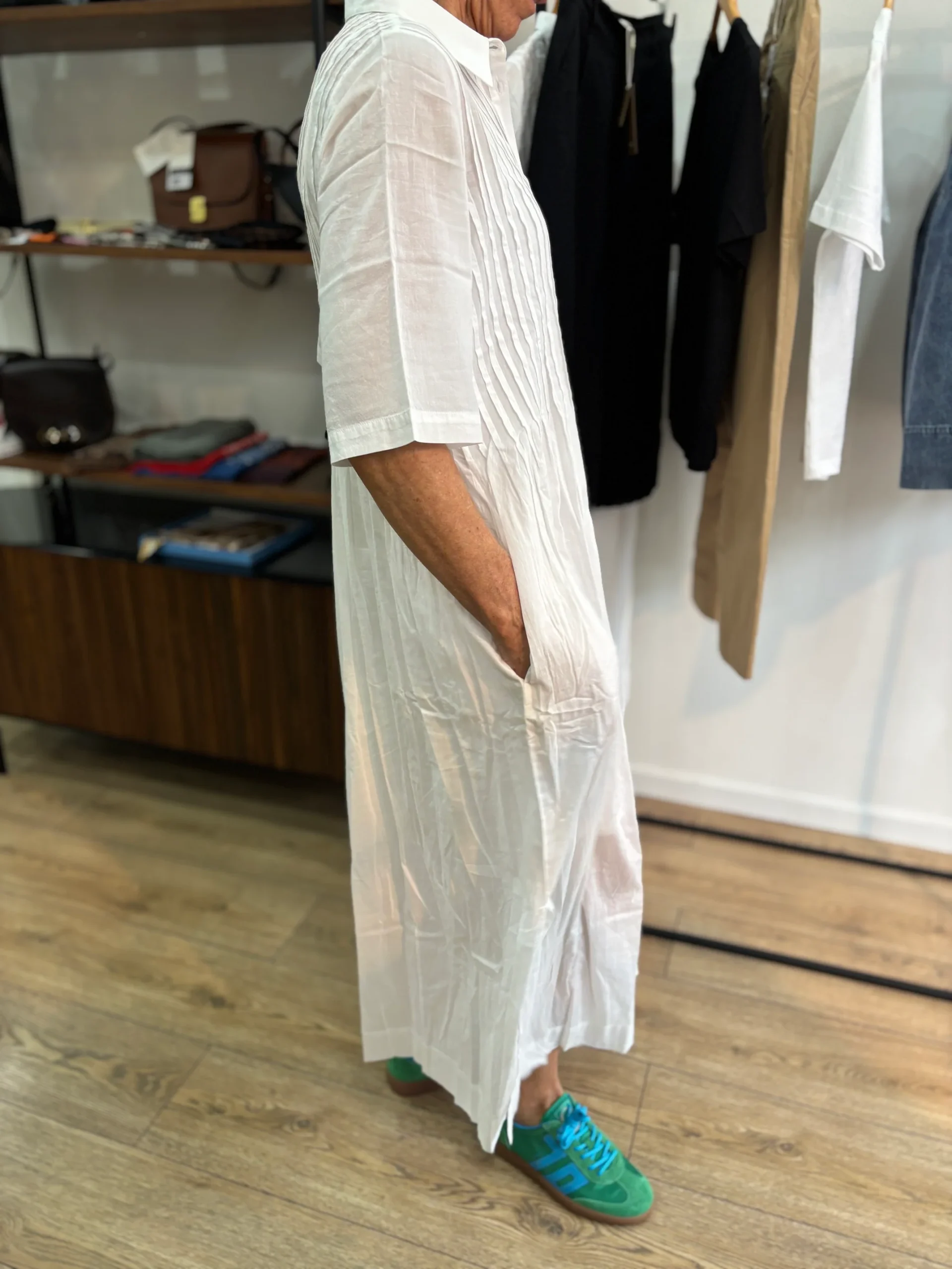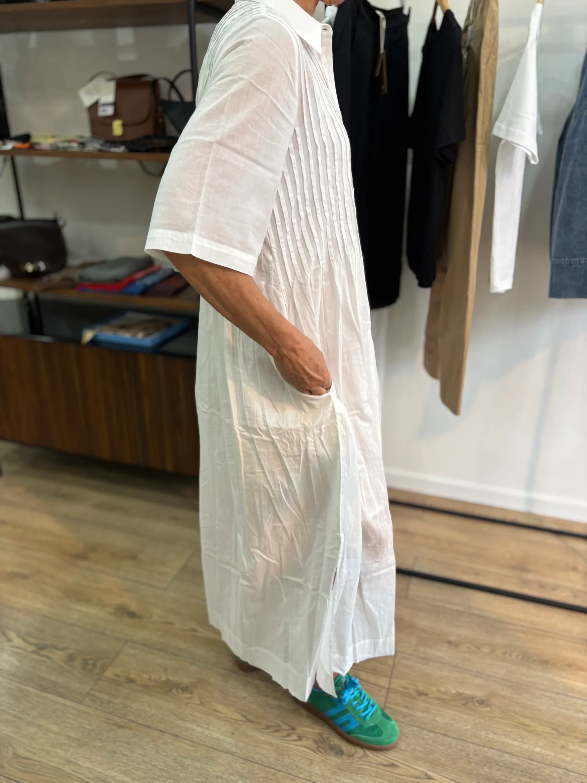 Matières : Coton bio Coupe : Coupe ample avec des plis au niveau du buste. Ouverture par boutonnage sur le devant. Forme du col : Col chemiseLongueur des manches : Manches courtesCouleurs / Motifs : Blanc Notre modèle porte une taille S et mesure 170 cm. Marque : YERSÉ Conseils d’entretien : Lavage en machine […]