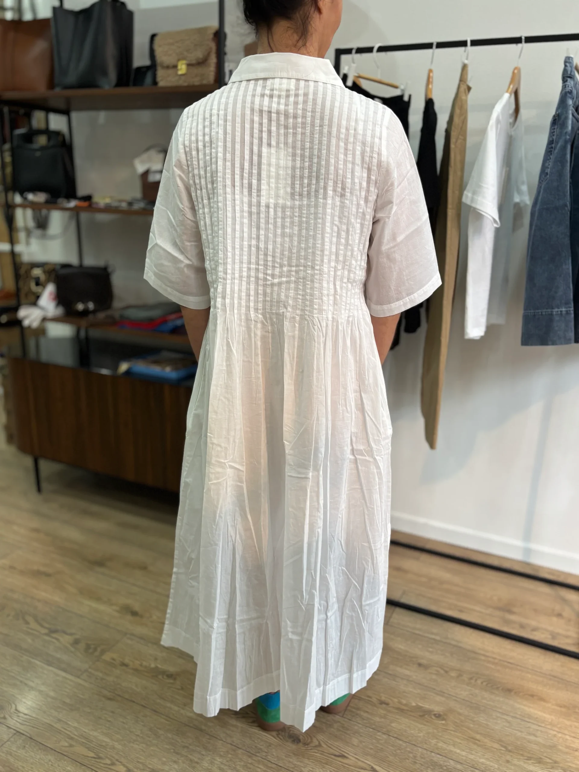 Coupe : Coupe ample avec des plis au niveau du buste. Ouverture par boutonnage sur le devant.