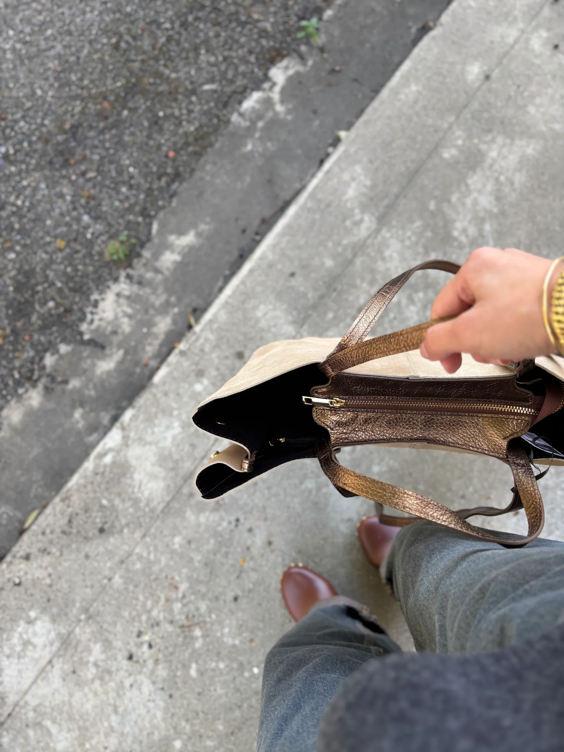 Matières extérieures : Cuir veloursMatières doublure : Textile Compartiments : Un grand compartiment avec un pochette intérieure zippée et une autre sans fermeture.Anses / Bandoulières : Deux anses pour un porté main et deux anses plus longues pour un porté épaule.Motif / Couleur : BeigeDimensions : 27 X 39 X 14 cm Nom du modèle […]
