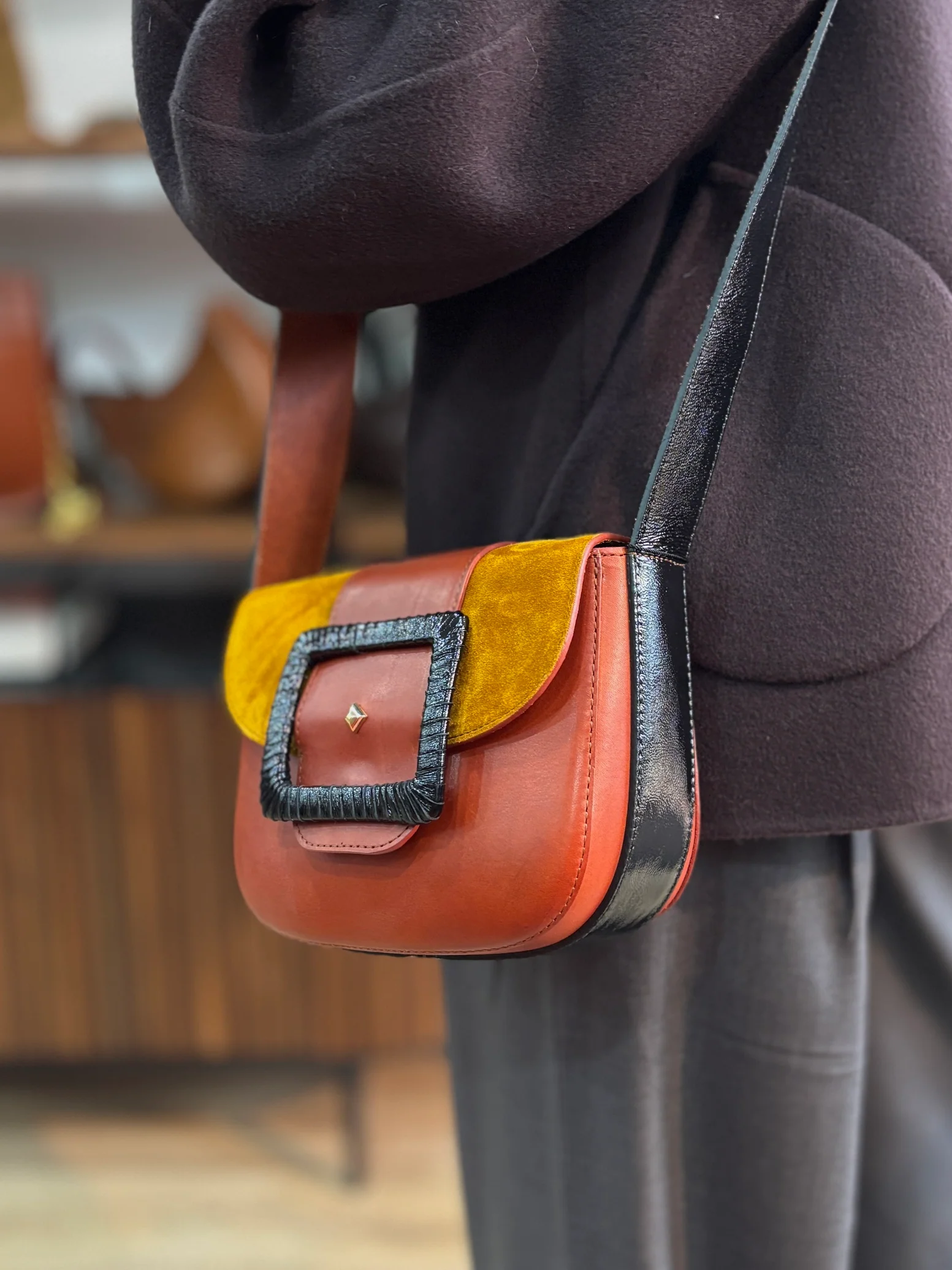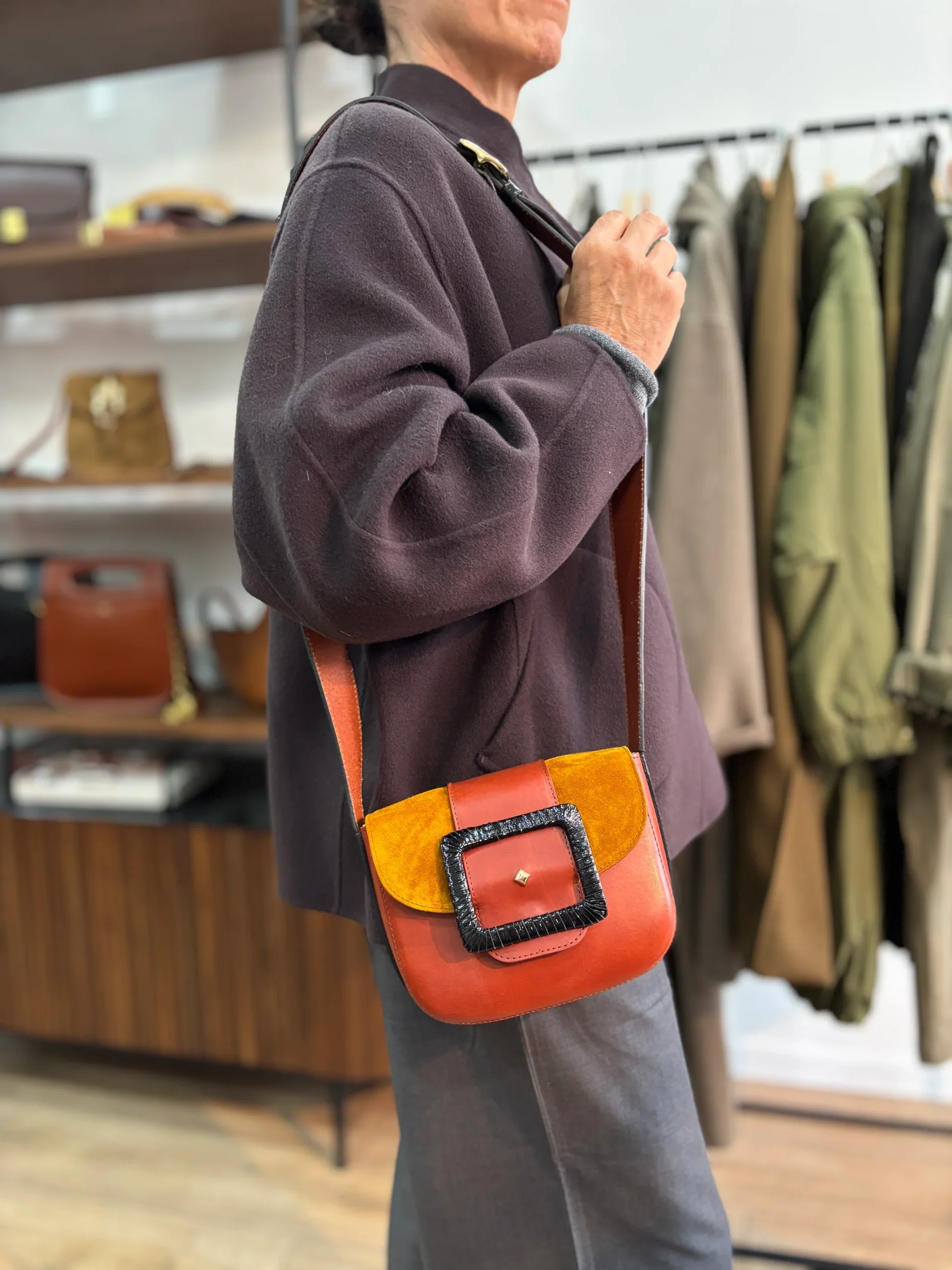 Matières extérieures : Cuir de vachette vernis et lisse + croute de cuir.Doublure : OuiMatières doublure : Croute de cuir Compartiments : Un seul compartiment avec une fermeture aimantée.Anses / Bandoulières : Une anse ajustable 110 cm max.Motif / Couleur : Dimensions : 18 x 16 x 8 cm Nom du modèle : LE JUNEMarque […]