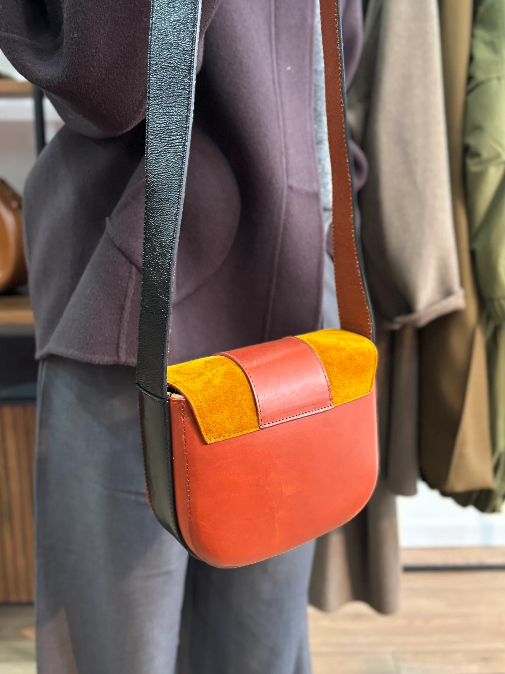 Matières extérieures : Cuir de vachette vernis et lisse + croute de cuir.