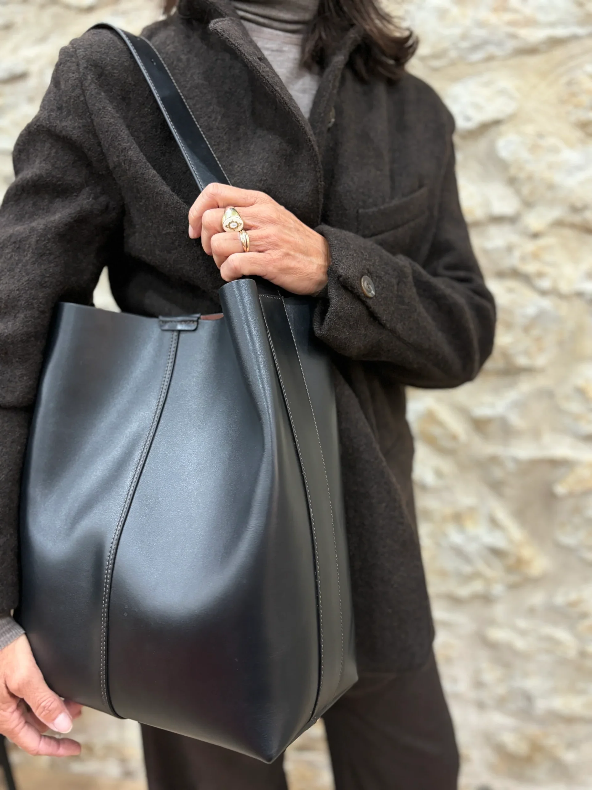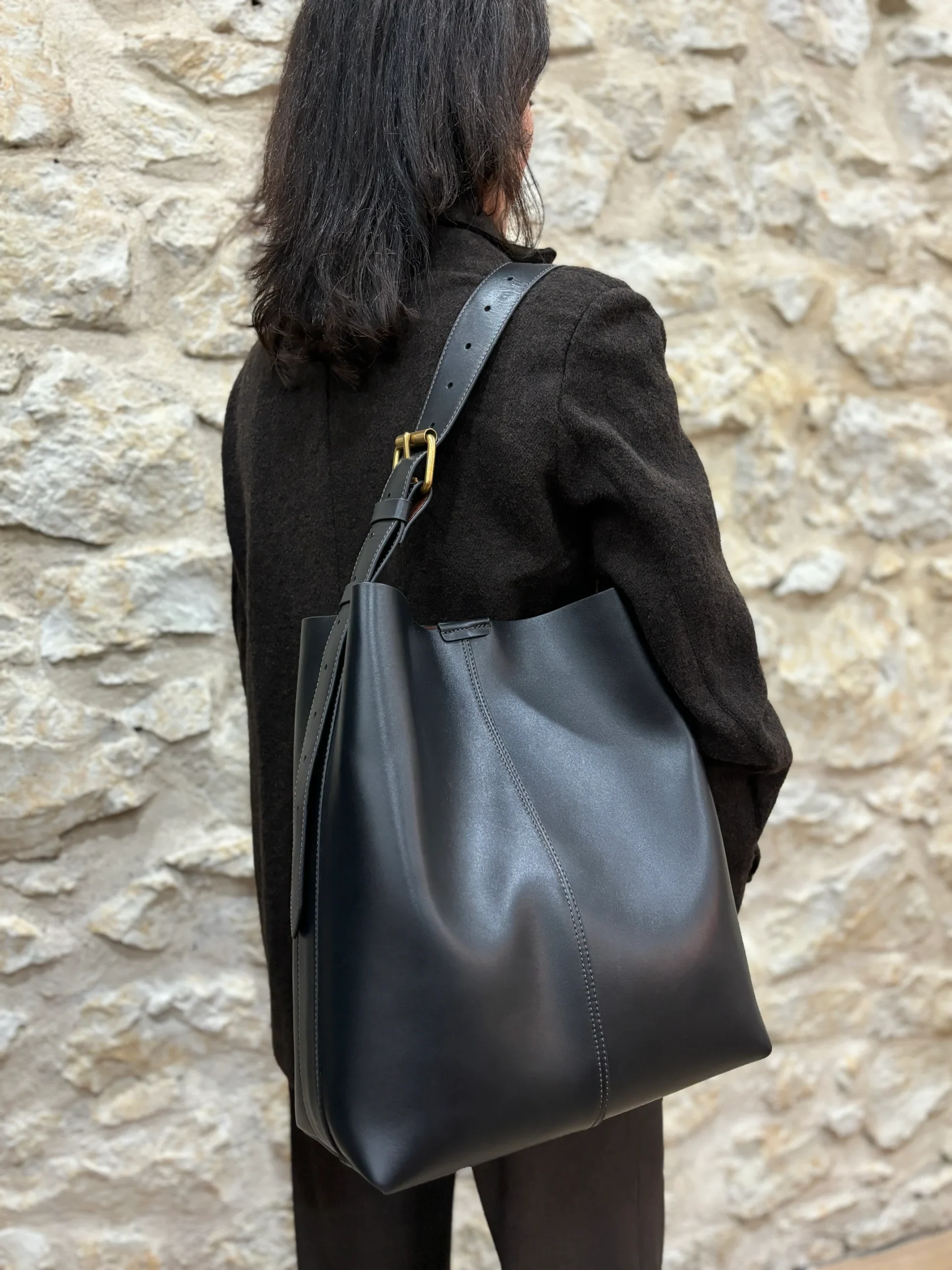 Grand sac sceau bicolore oversize en cuir souple à base rectangulaire. Fermeture avec bouton pression. Porté épaule ou bandoulière. Matières extérieures : Cuir de vacheDoublure : OuiMatières doublure : Cuir de mouton Compartiments : Un grand compartiment.Anses / Bandoulières : Bandoulière réglable avec boucle en métal doré. Longueur minimale 18 cm et maximale 41 cm.Motif […]