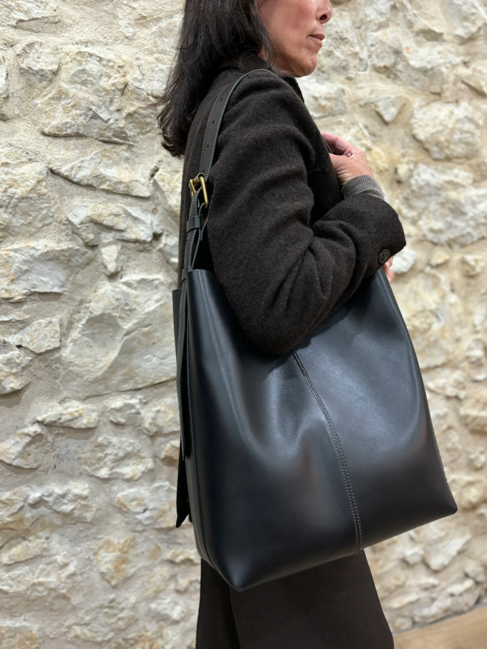 Grand sac sceau bicolore oversize en cuir souple à base rectangulaire. Fermeture avec bouton pression. Porté épaule ou bandoulière.