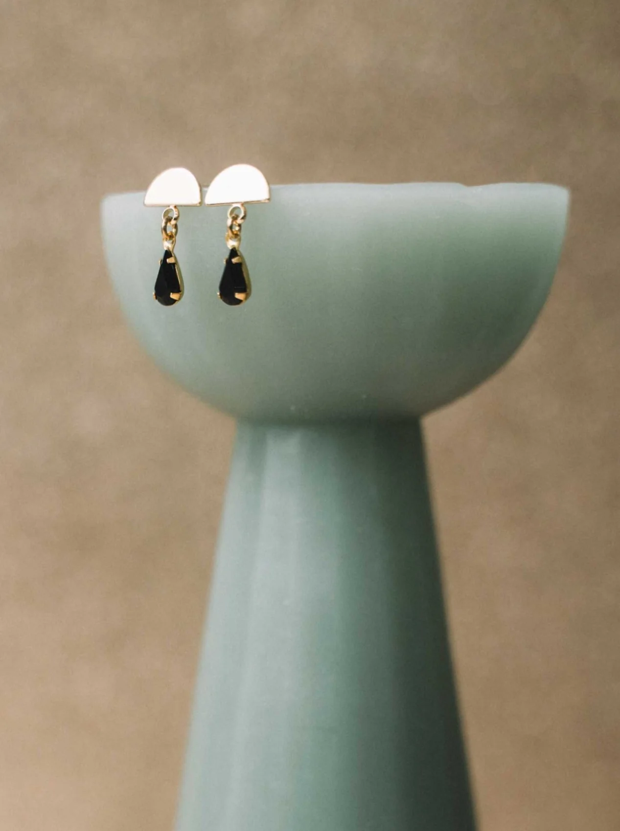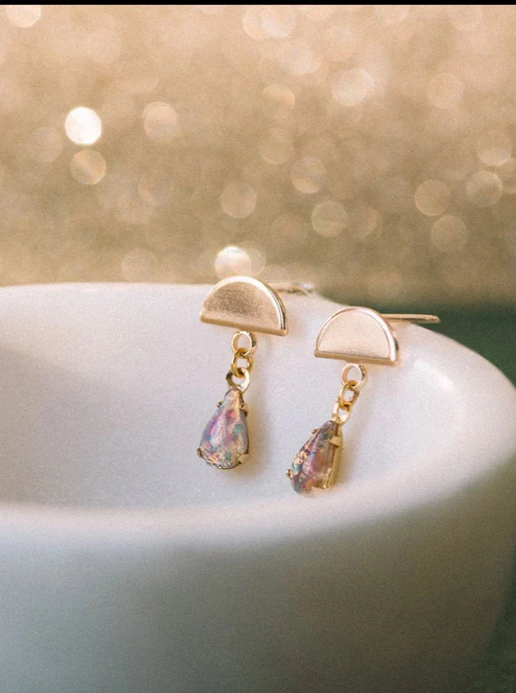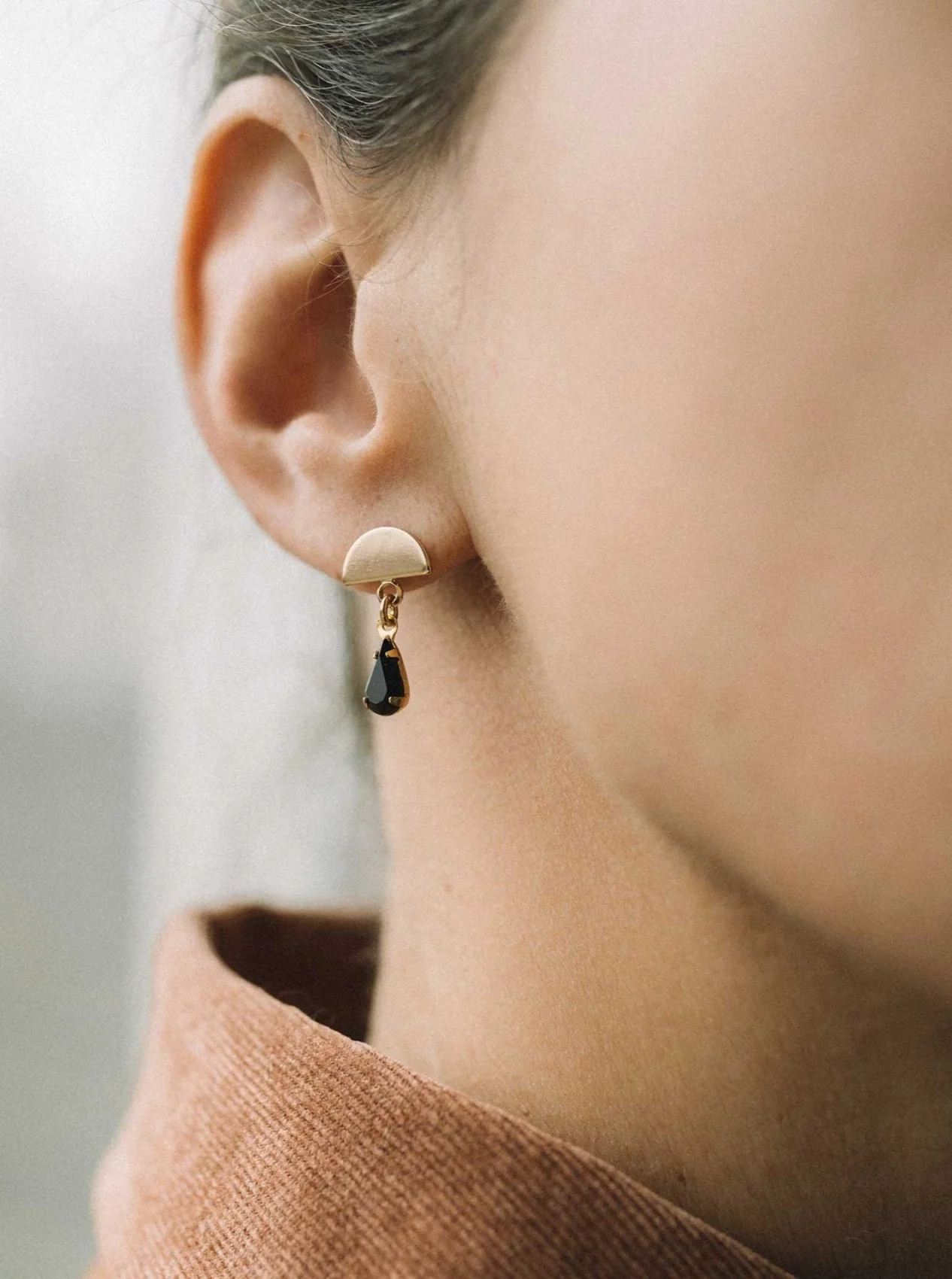 Création locale, faite avec amour et talent à Montréal. Boucles sur tige en forme de demi-cercle avec gouttes de verre rose opale ou noir (cabochons vintage). Laiton plaqué or. Sans nickel ni plomb. Longueur : 2 cm (3/4 po)
