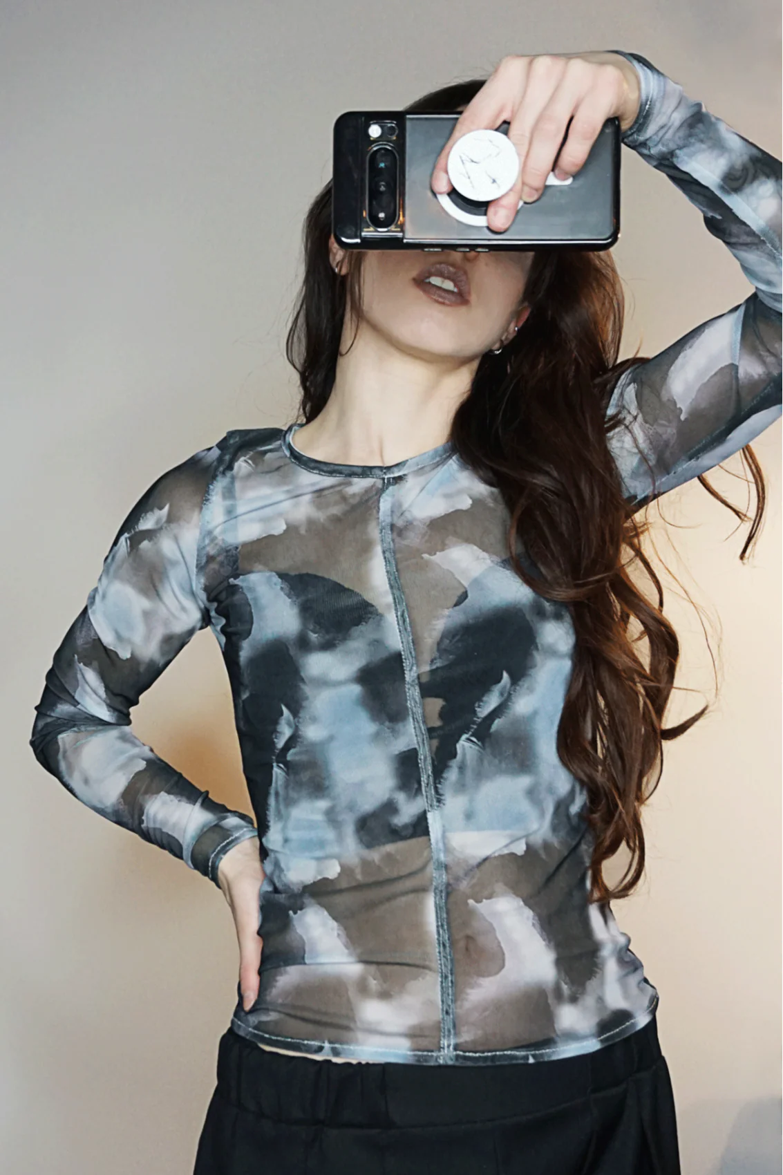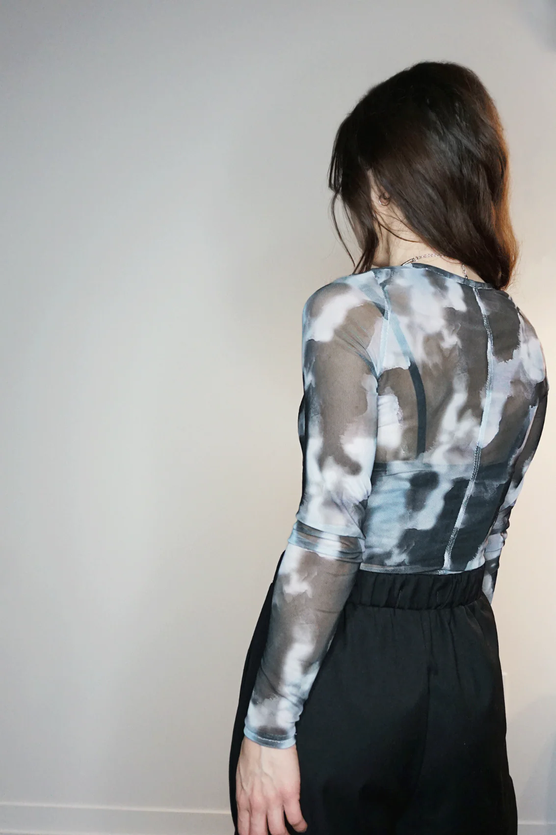 Chandail en mèche à manches longues, sublimée par un imprimé abstrait aux tons de noir, blanc et gris. Confectionné avec des coutures anglaises, elle présente une encolure délicatement bordée de biais pour une finition raffinée. Les doubles surpiqûres contrastées devant et derrière apportent une touche de caractère à cette pièce élégante et moderne.