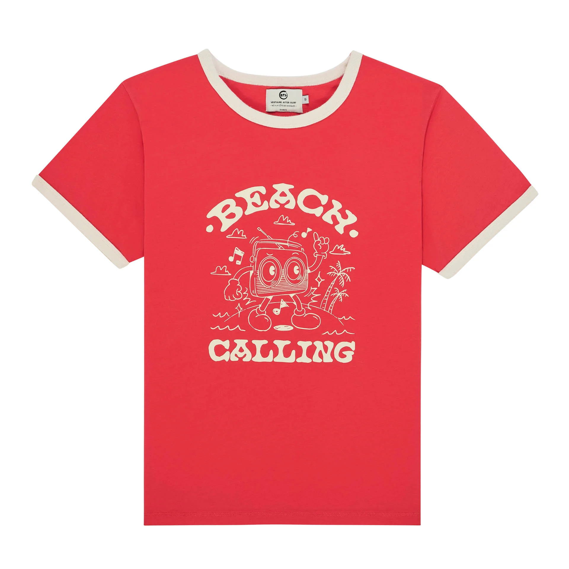 Le T-shirt femme Beach Calling rouge. T-shirt légèrement loose, qui dispose d’un print à l’avant femme écrit en crème en rappel aux RIB col et manches contrastés. Coupe : légèrement loose Matière: 100% coton organique