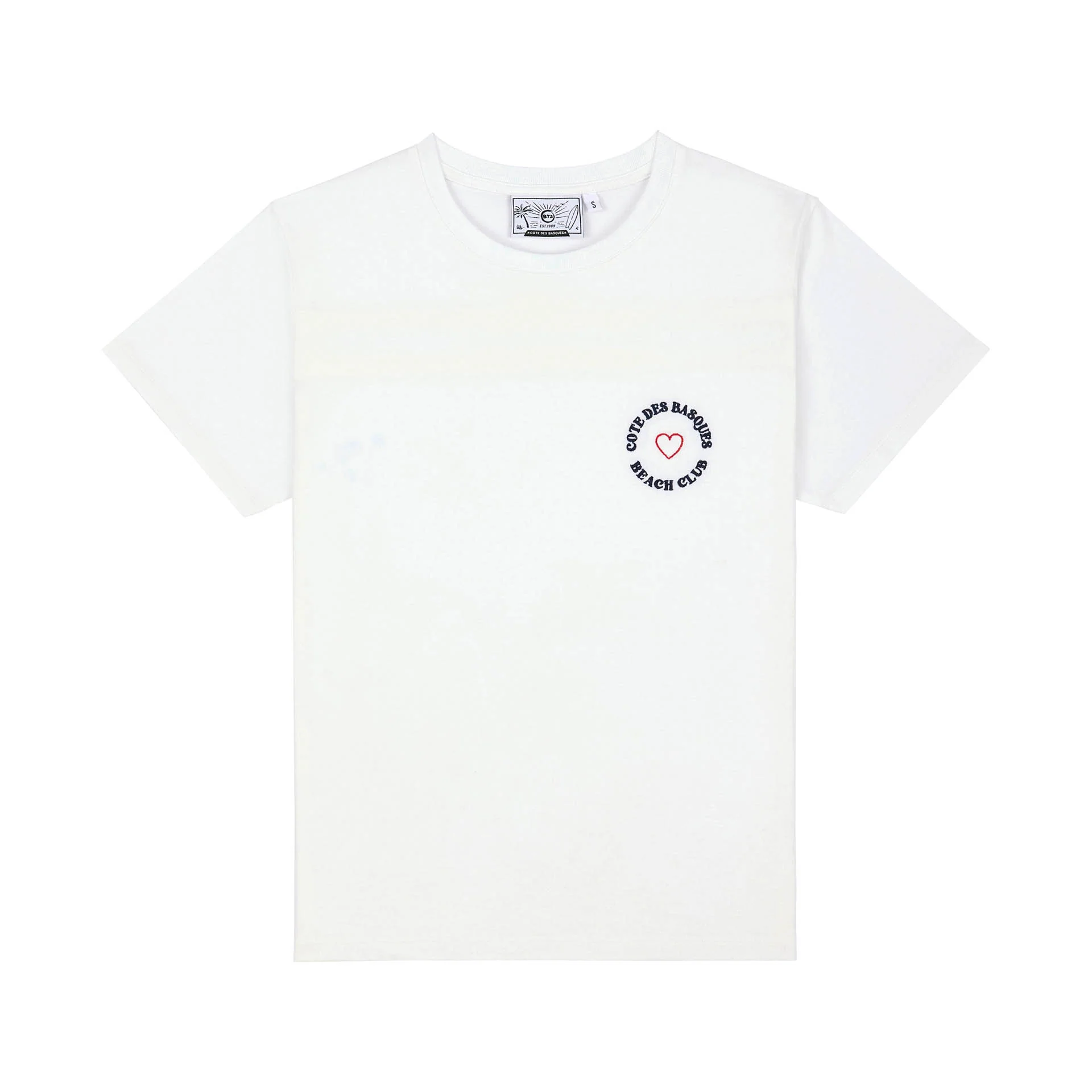 Le t-shirt brodé Côte des Basques Beach Club femme blanc en coton biologique, coupe droite classique, manches courtes. Brodé en blanc et rouge au niveau de la poitrine.
