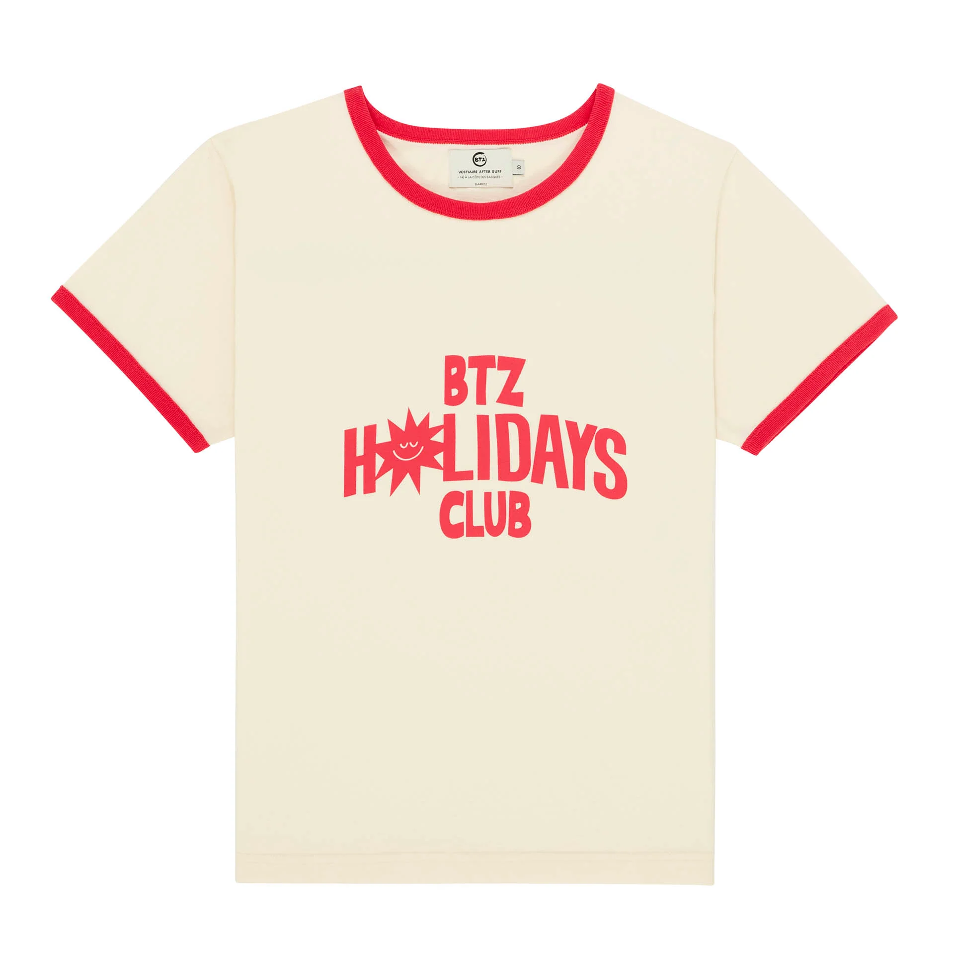Le T-shirt Holidays club femme. T-shirt légèrement loose, qui dispose d’un print à l’avant Holidays club écrit en rouge en rappel aux RIB col et manches contrastés. Coupe : légèrement loose Matière: 100% coton organique