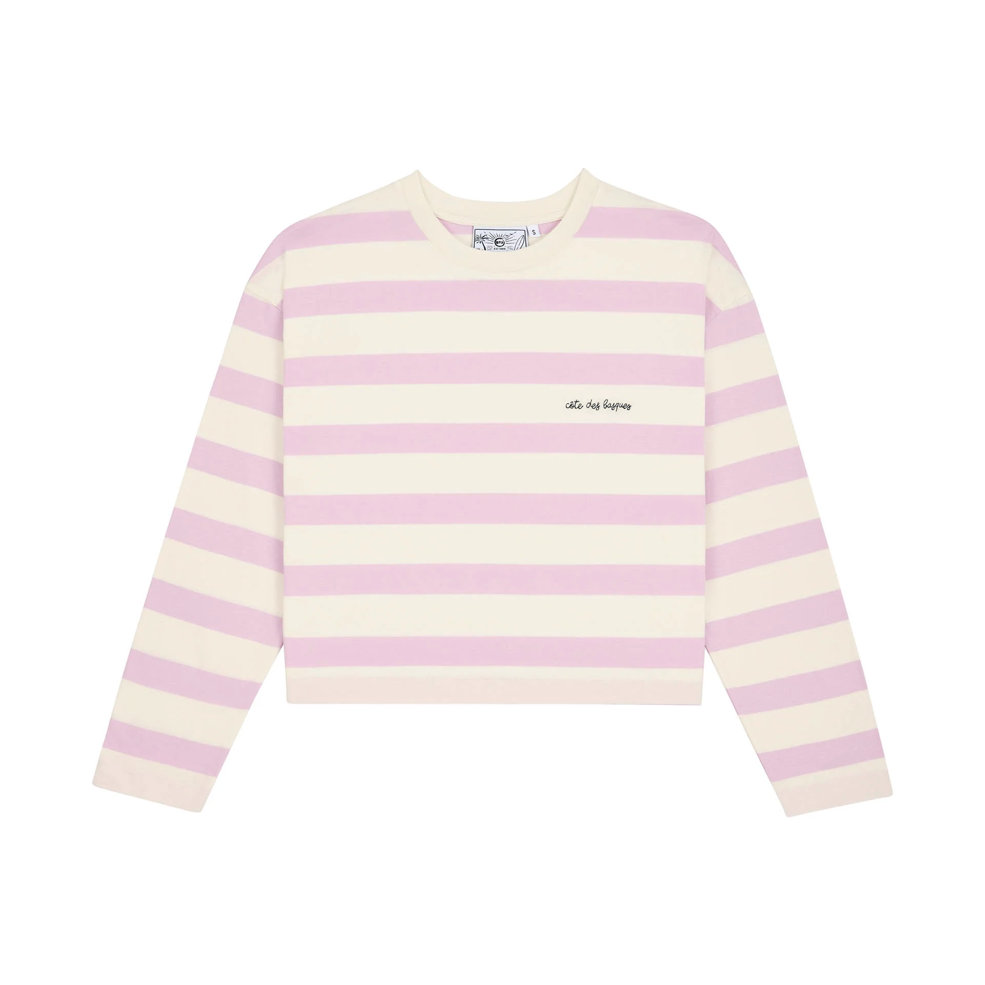 Marinière mauve en coton biologique, fit oversized, court, brodé en marine au niveau de la poitrine, ce modèle présente la mention côte des basques.