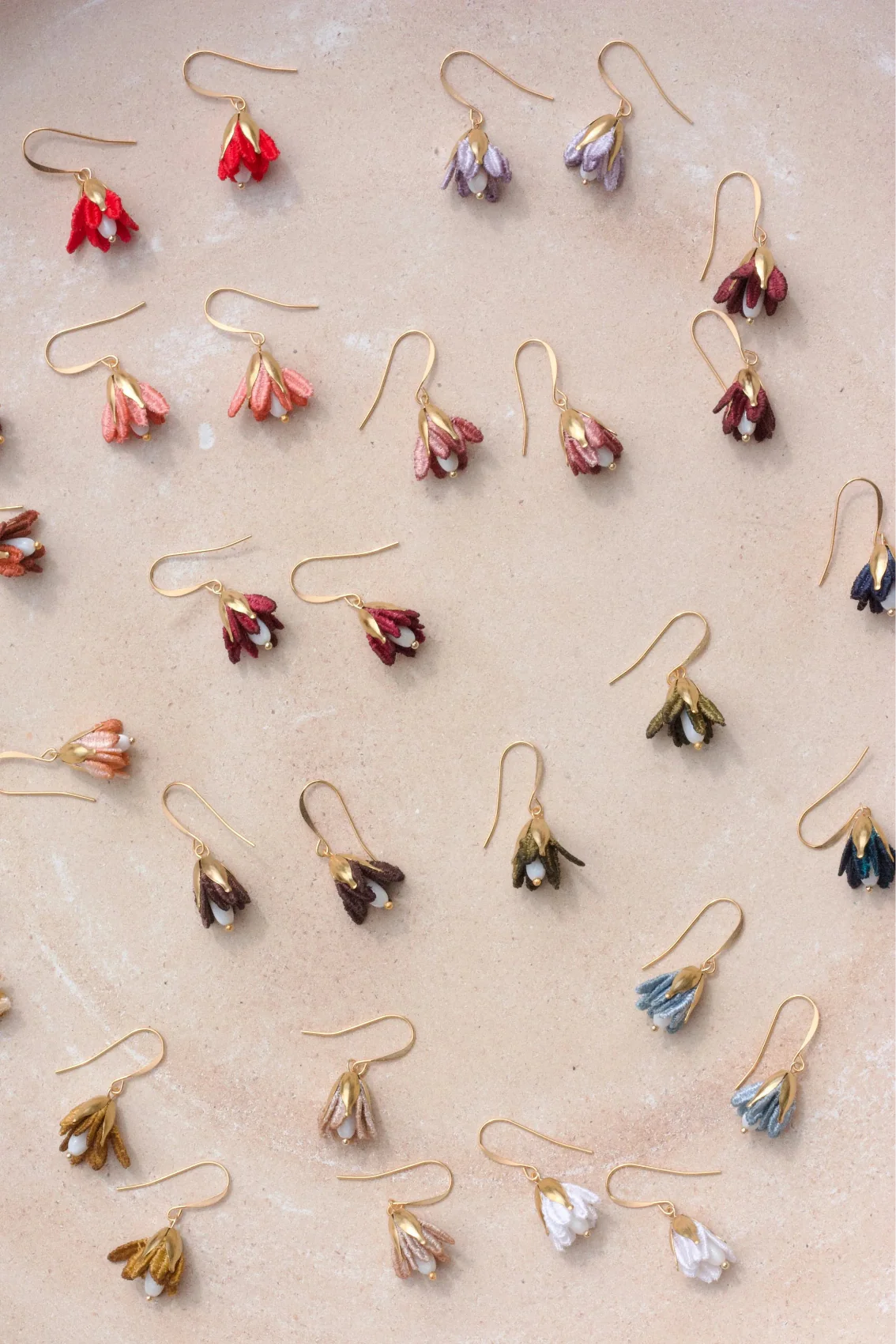 Composées de dentelle vintage blanche ou d’une de nos couleurs teintes à la main inspirées du monde botanique, de perles de coquillage blanches subtilement nacrées et de composants en laiton brut, avec crochets d’oreilles hypoallergéniques plaqués or, ces boucles d’oreilles sont sans doute les plus faciles à enfiler avant de sortir.