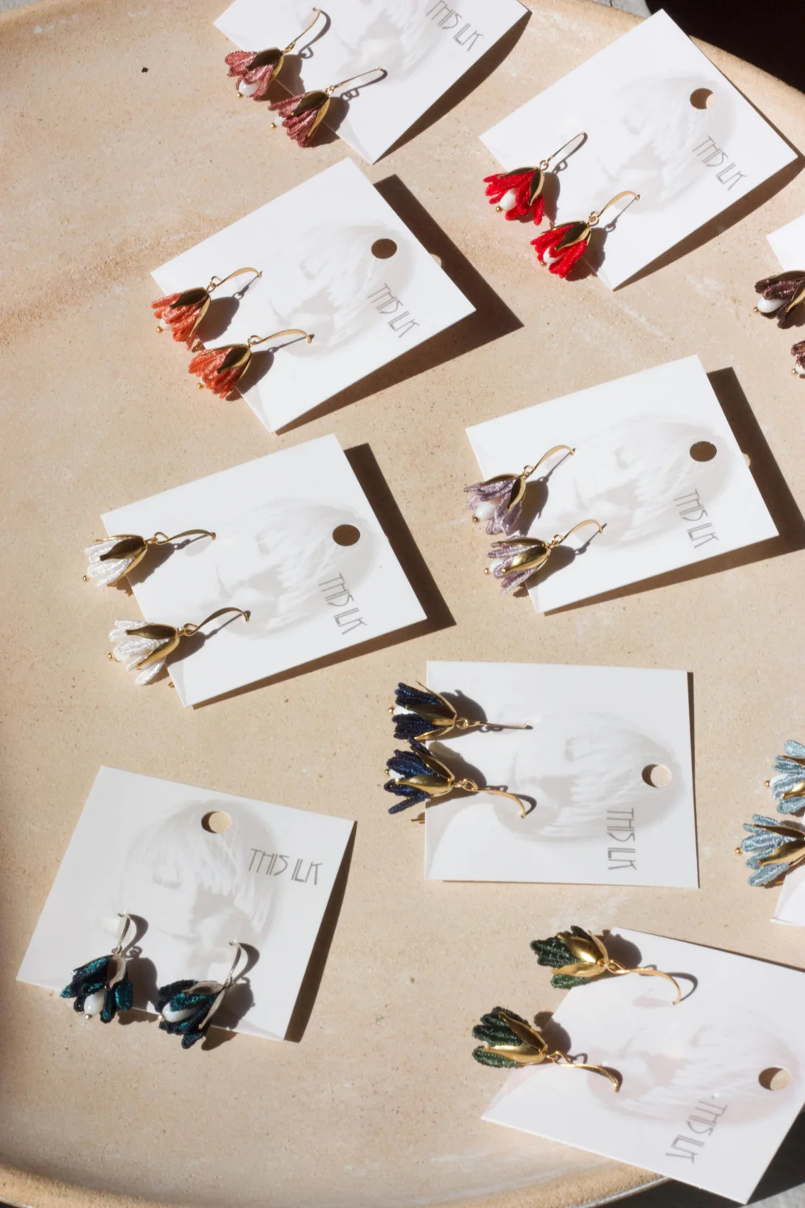 Création locale, faite à la main avec amour, talent et passion à Montréal. Ces boucles d’oreilles pendantes sont idéales pour arborer nos fleurs en dentelle signature, en toute subtilité et confort. Inspirées du jasmin Sambac, utilisé pour la fabrication du thé au jasmin et des parfums, elles complètent parfaitement le collier Malli et peuvent être […]