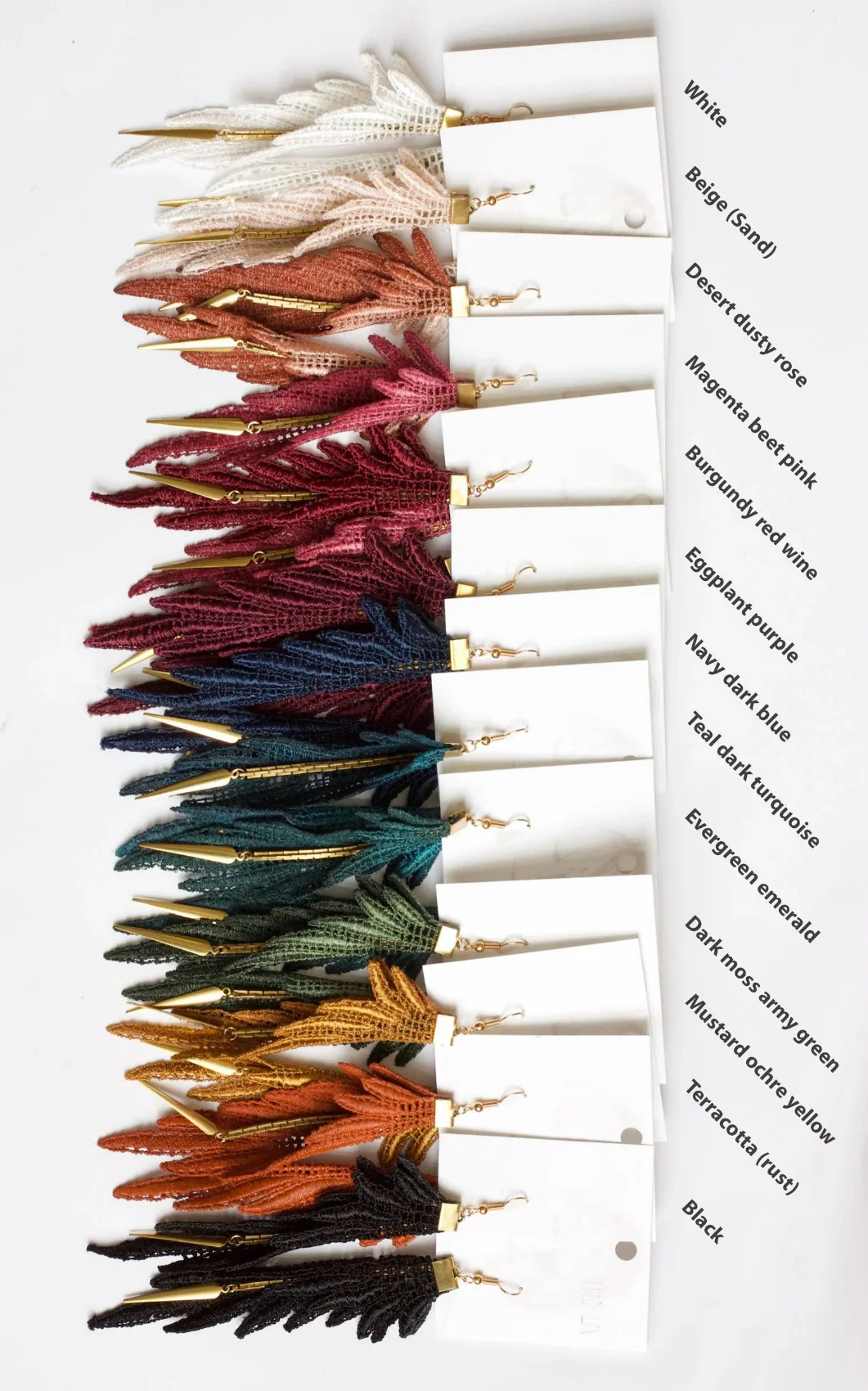 Création locale, faite à la main avec amour, talent et passion à Montréal. Ces boucles d’oreilles extrêmement légères possèdent un équilibre parfait entre la taille, le poids et la forme. Leur forme permet d’allonger délicatement le cou et convient à presque tout le monde! Les boucles d’oreilles Pendulum sont composées de dentelle vintage teinte à […]