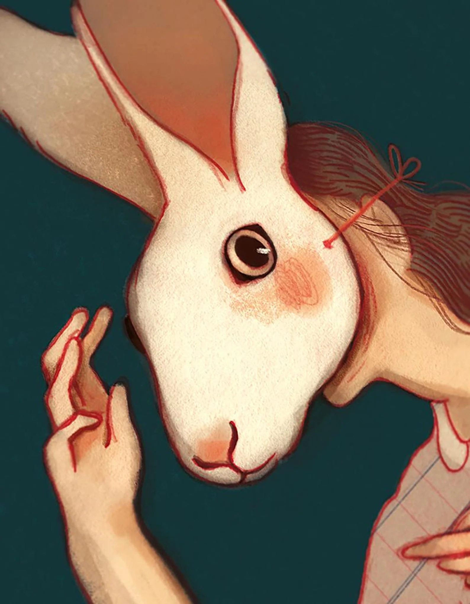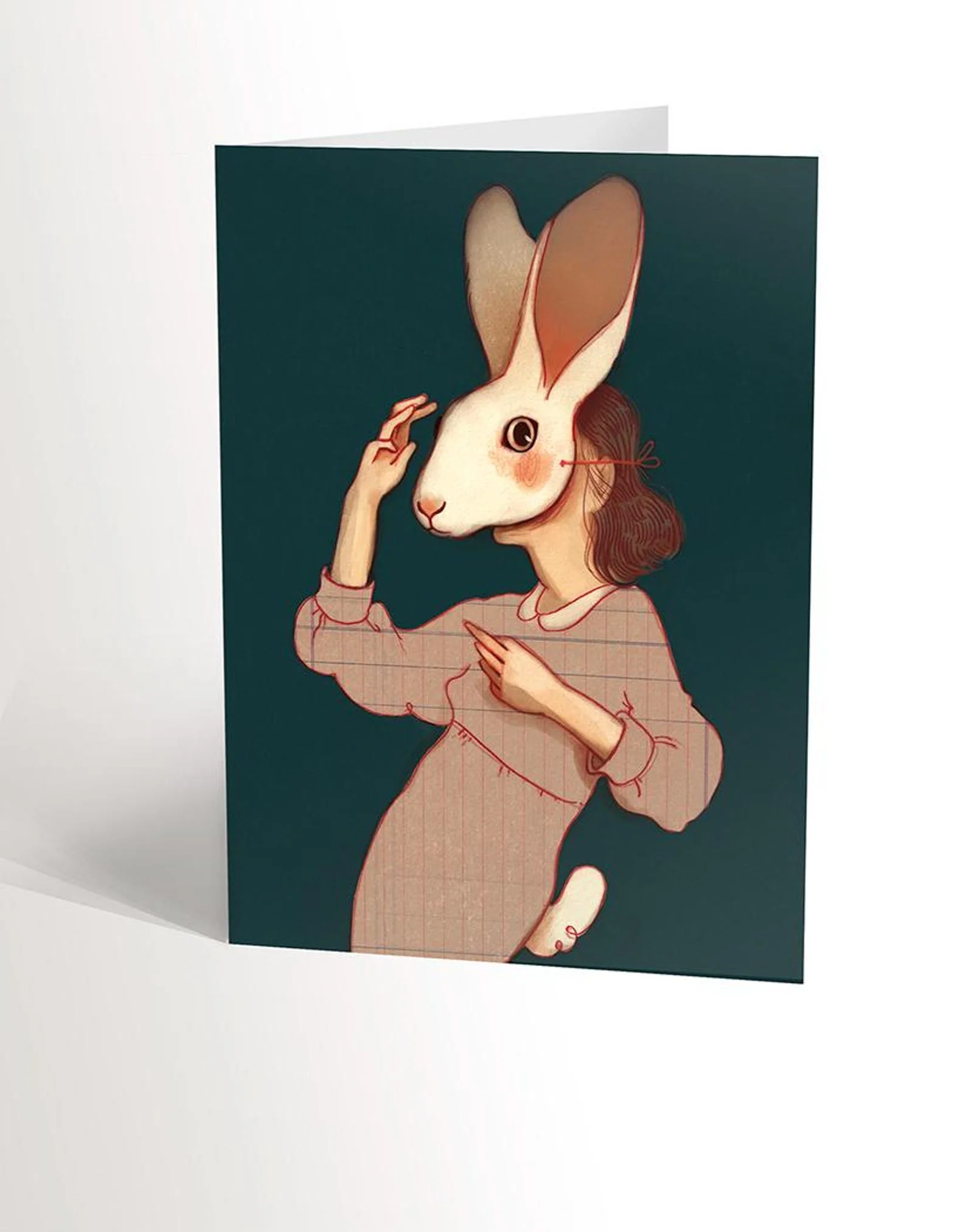 Carte de souhait, sans texte, représentant une femme avec un masque de lapin !