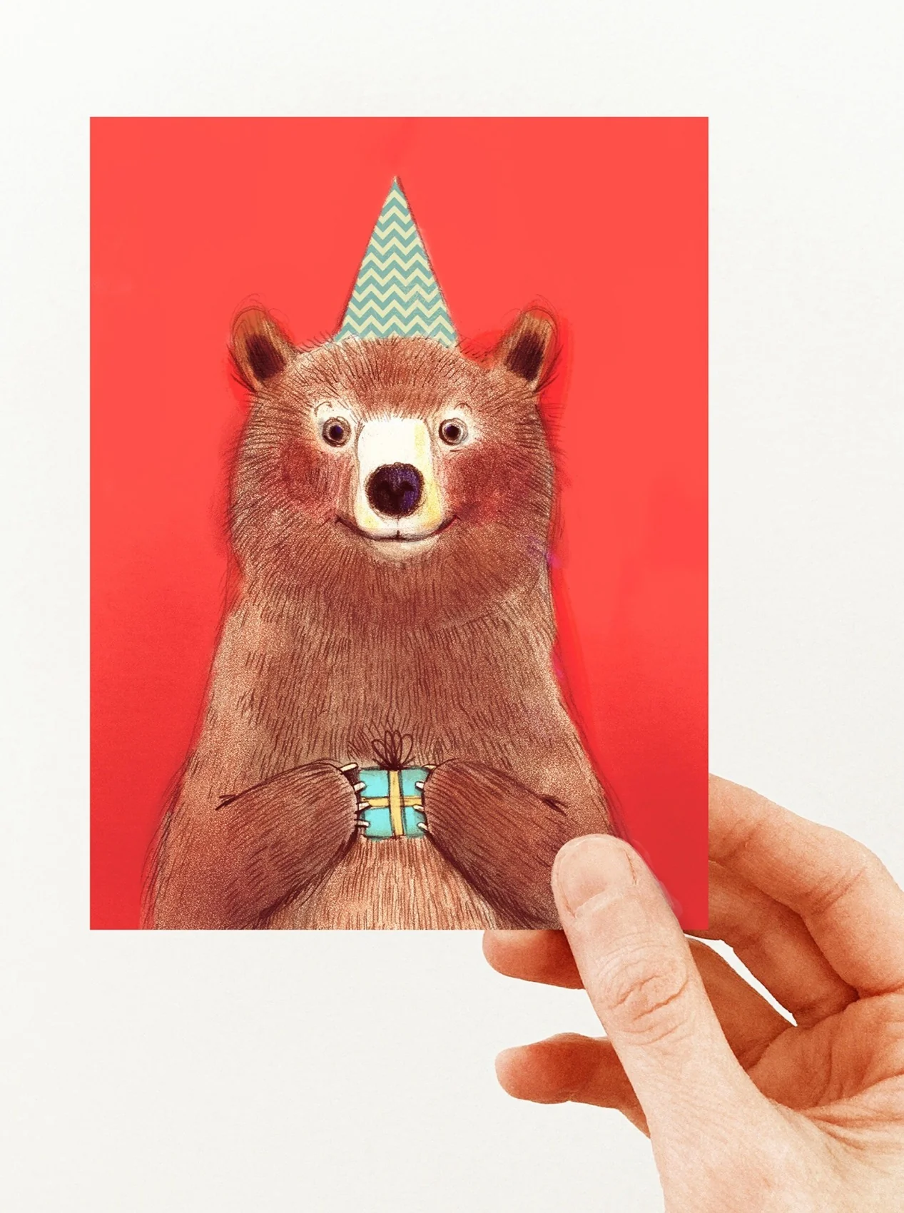 Création locale, faite avec amour et talent à Montréal. Carte de souhait, sans texte, représentant un ours festif sur un fond rouge! Carte imprimée au Québec et fournie avec son enveloppe blanche. Dimensions: 4,25’’ x 5,5’’.