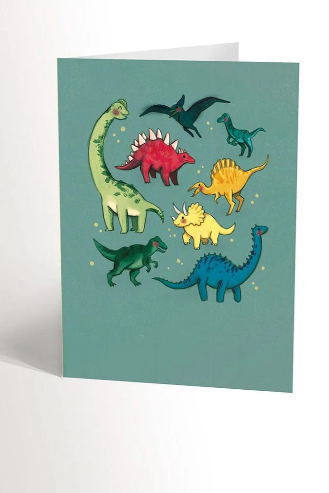 Carte de souhait, sans texte, représentant plein de dinosaures !