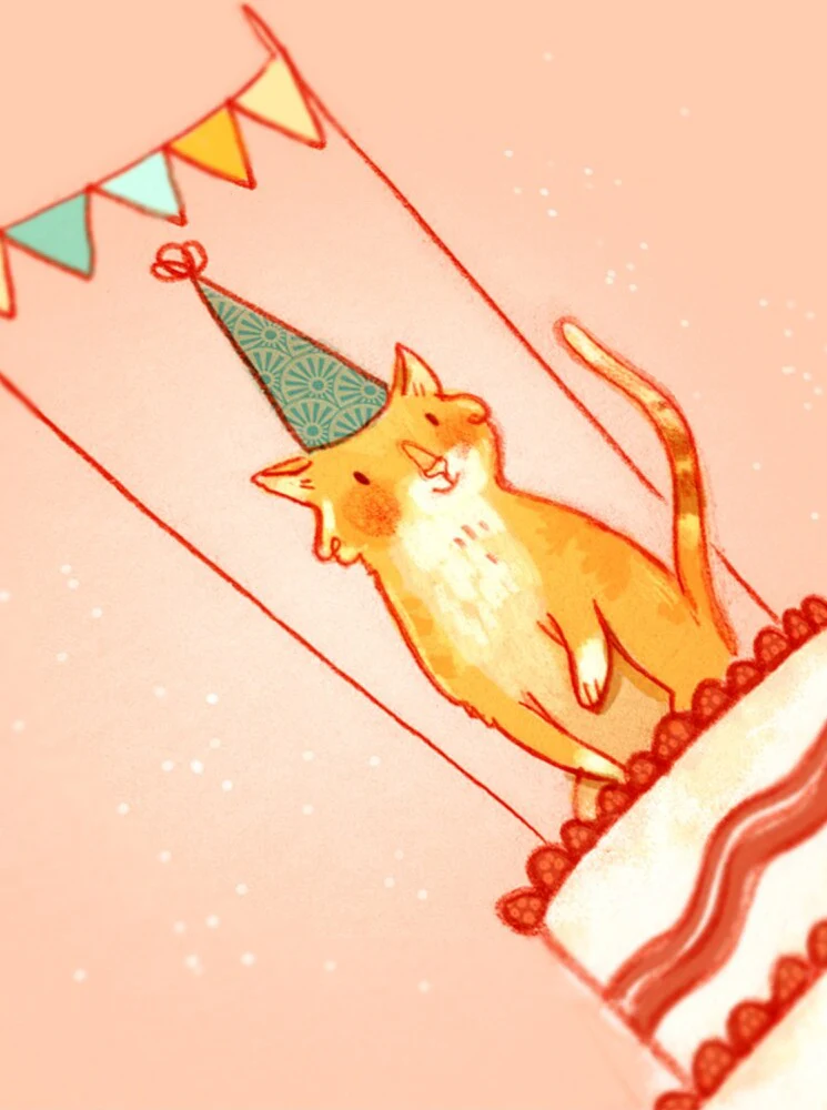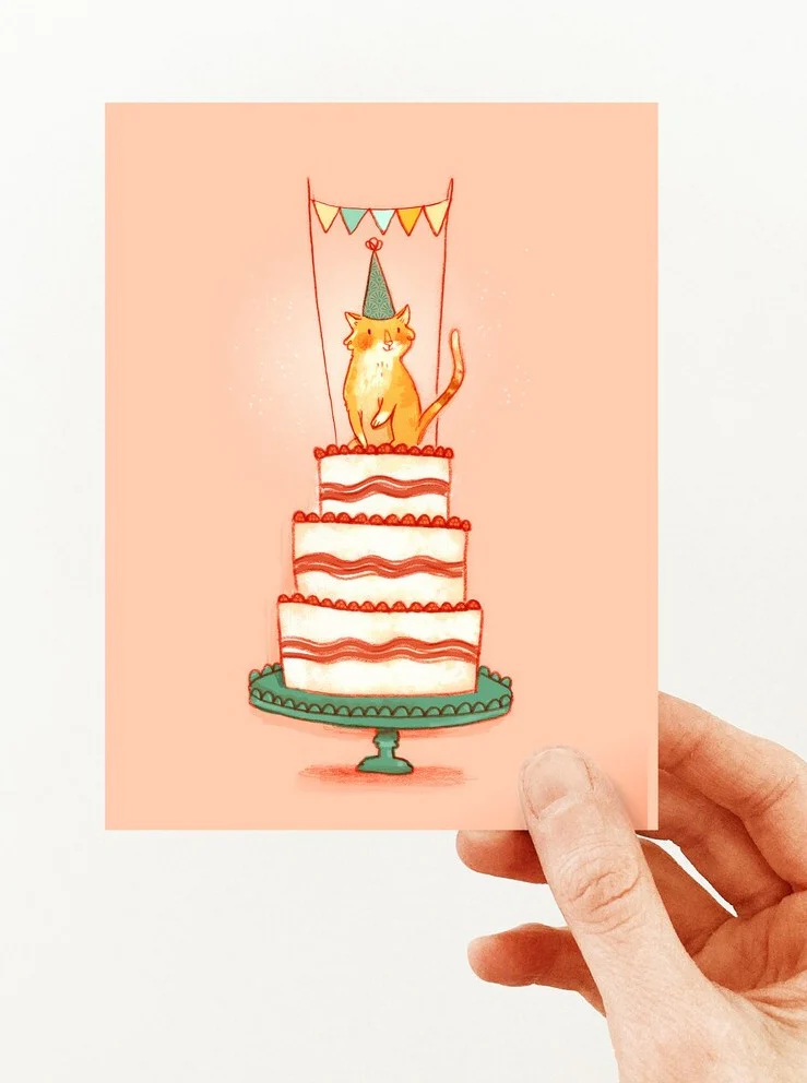 Création locale, faite avec amour et talent à Montréal. Carte de souhait, sans texte, représentant un Chat de fête sur son gâteau ! Carte imprimée au Québec et fournie avec son enveloppe blanche. Dimensions: 4,25’’ x 5,5’’.