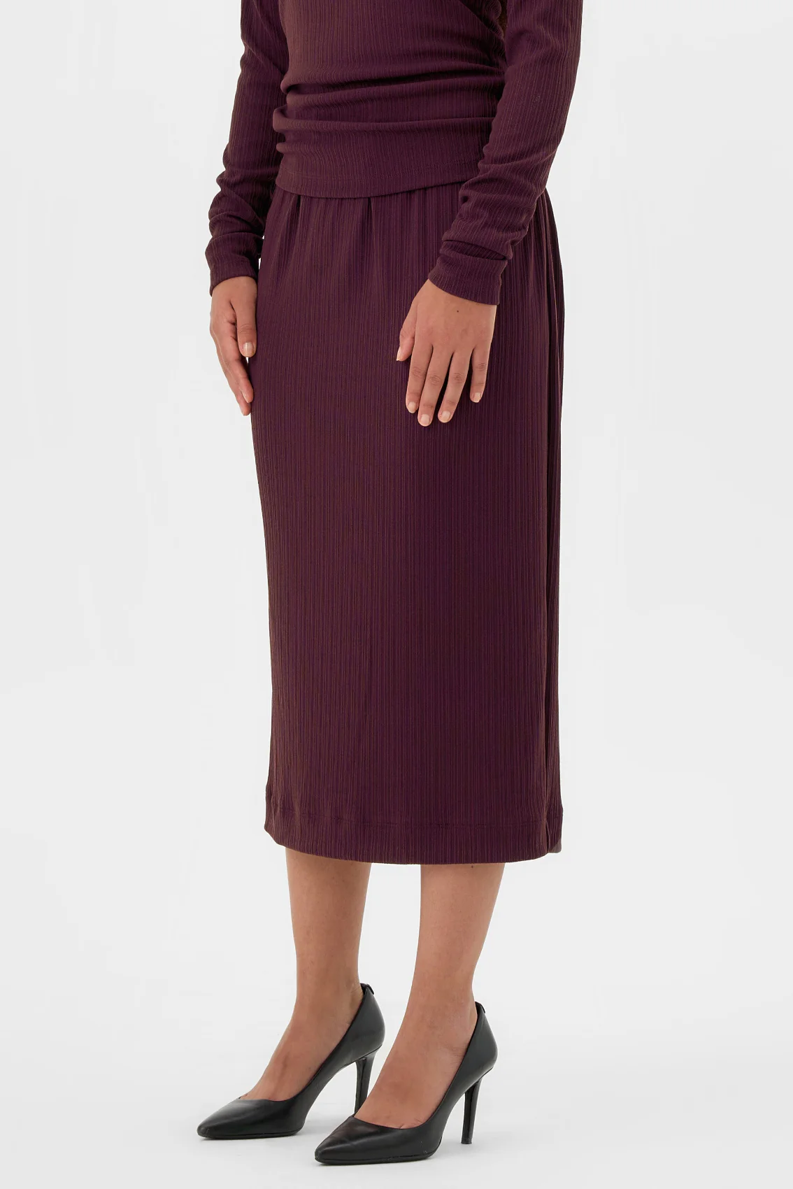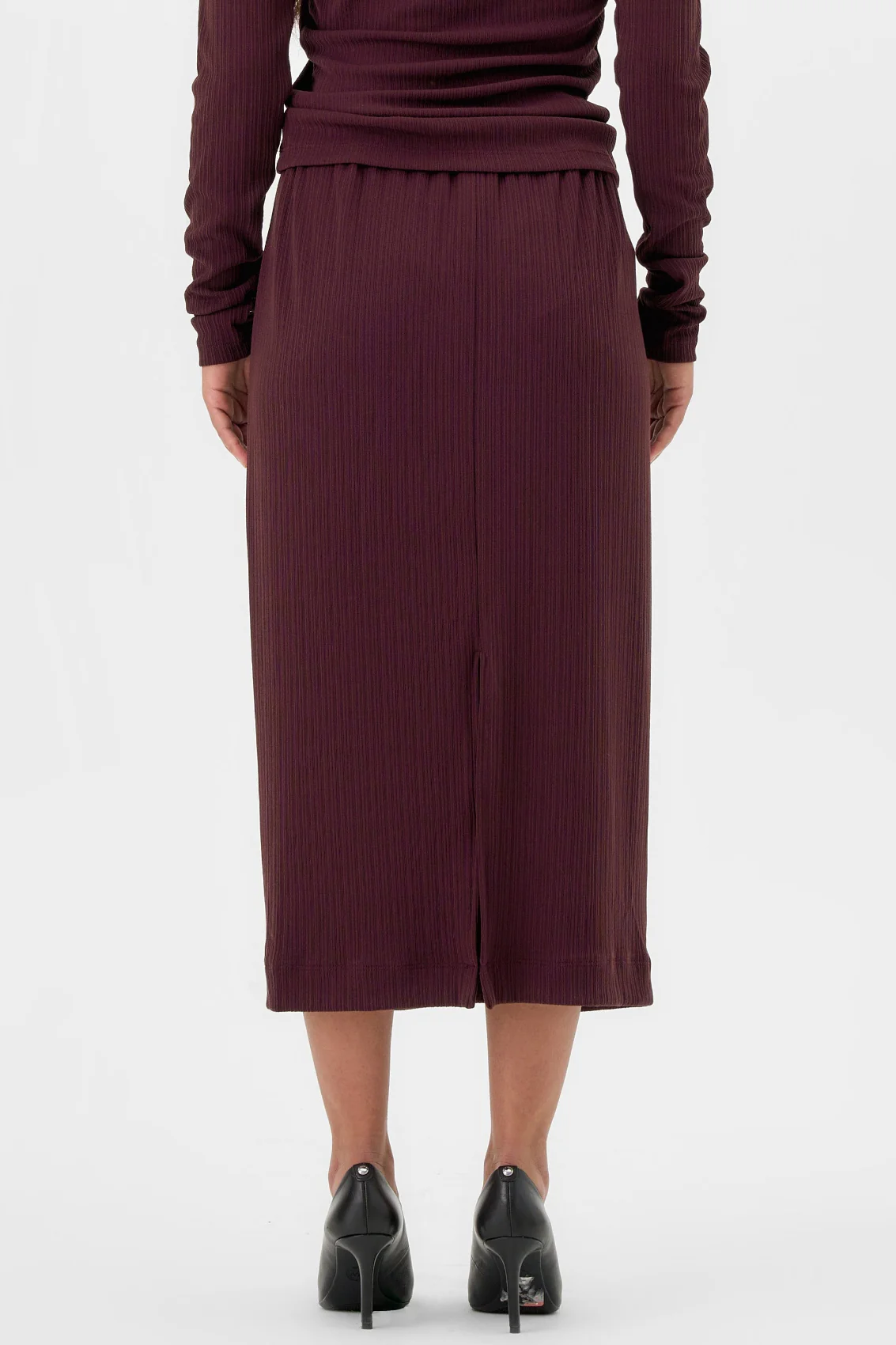Cette jupe midi allie élégance et simplicité avec sa taille élastique confortable et sa fente au centre du dos. Le tissu côtelé, très extensible, se distingue par sa couleur éclatante. Elle complète parfaitement le haut à col montant pour un look harmonieux et sophistiqué.