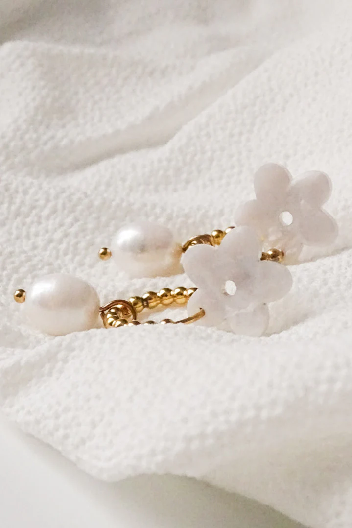 - Fleurs en acétate de cellulose avec tiges en acier inoxydable + anneaux plaqués or 18 carats sur acier inoxydable (hypoallergéniques) & perles d’eau douce.