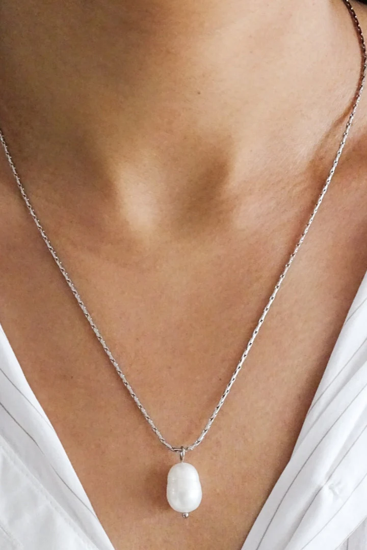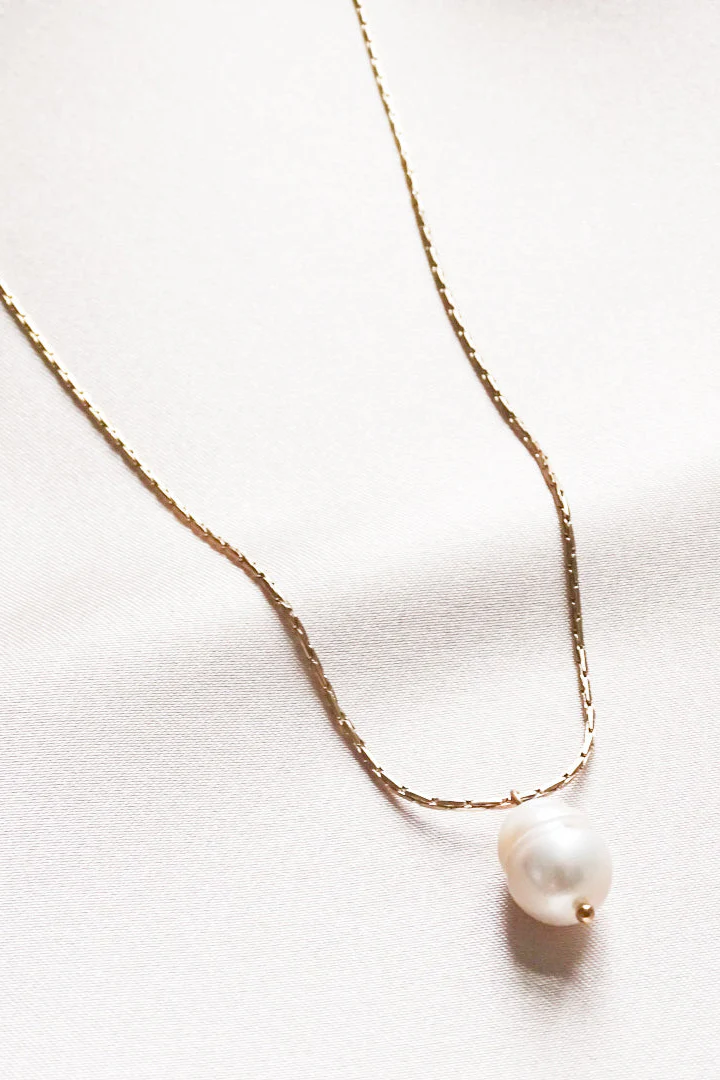 - Chaîne en acier inoxydable plaqué or 18 carats avec une perle baroque de 10 à 12 mm de long