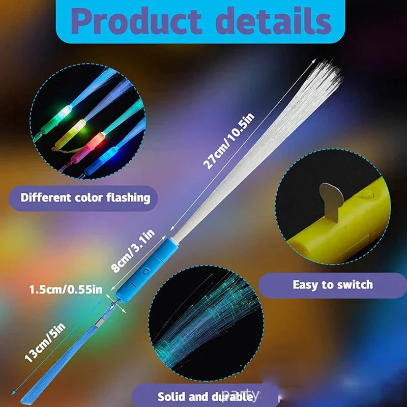 Le corps en plastique translucide intègre les fibres optiques, créant un effet scintillant discret qui complète une décoration moderne pour les mariages, anniversaires, fêtes d’enfants et autres célébrations. Placez-les sur les tables, autour des scènes ou en centres de table pour ajouter une ambiance lumineuse coordonnée lors des animations et des moments photo.