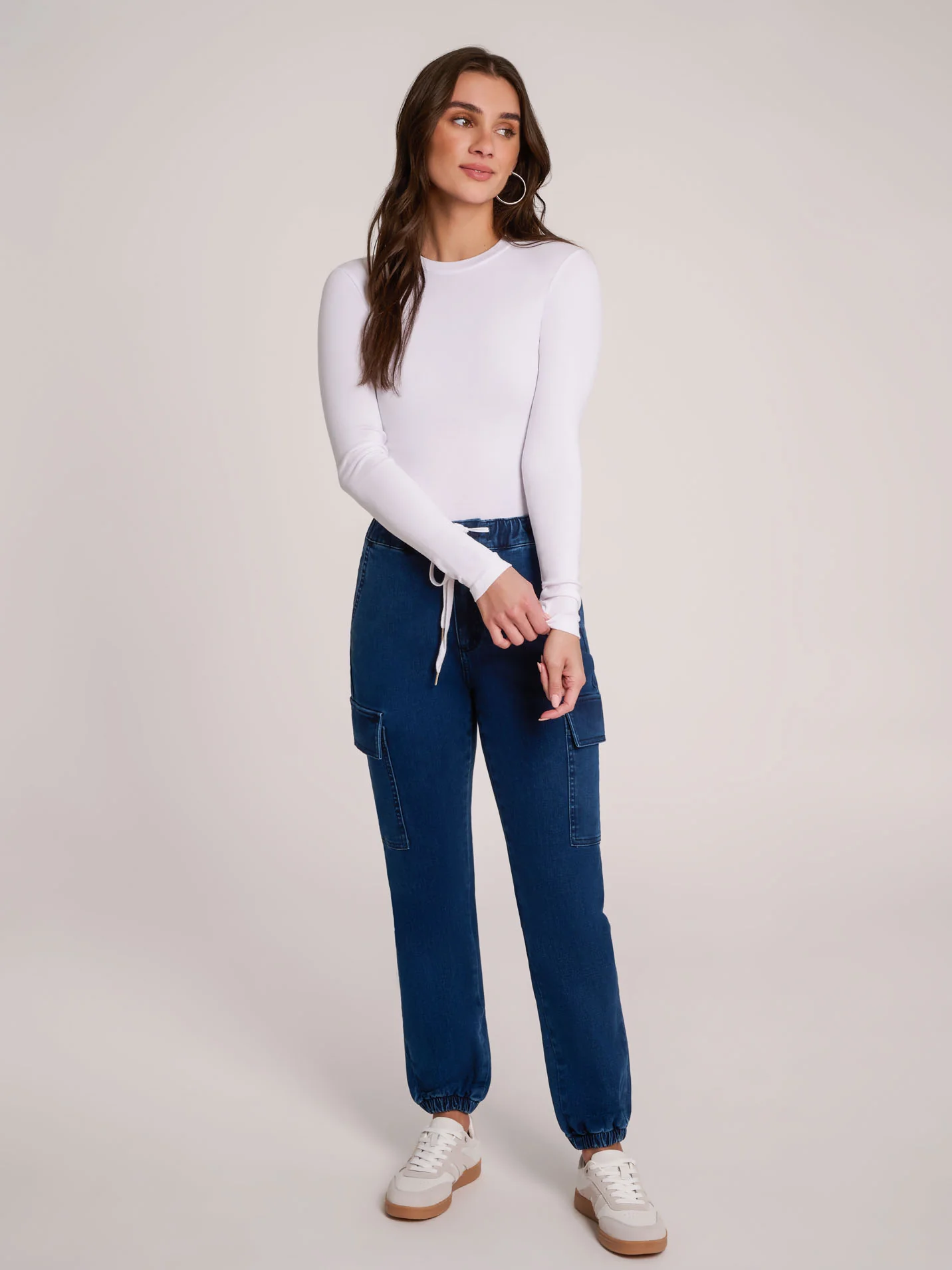 Une version actualisée du Capri Blue SS24, ce pantalon de jogging en denim taille haute bleu foncé présente un délavage subtilement délavé et des poches cargo d’inspiration utilitaire. Avec une taille élastique réglable, un cordon de serrage et des poignets élastiques, ils sont le mélange parfait de style et de confort pour se détendre ou faire des courses.