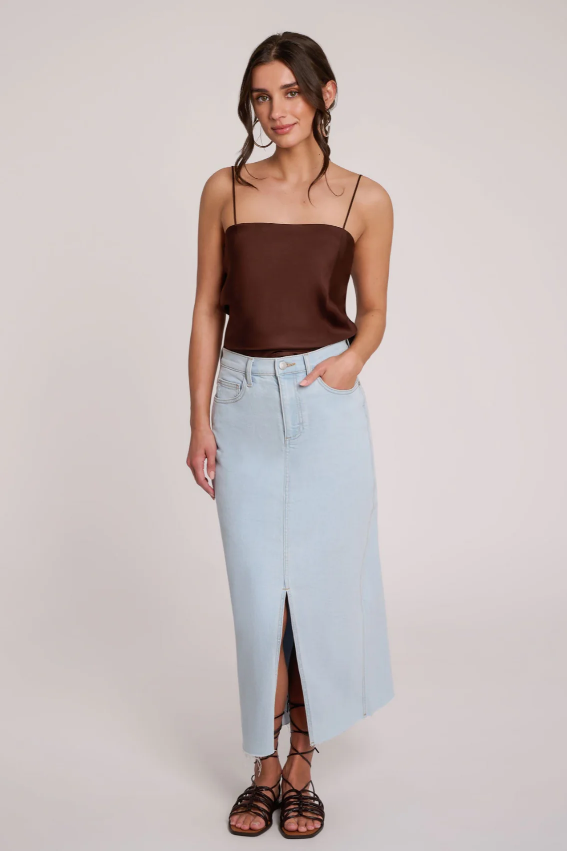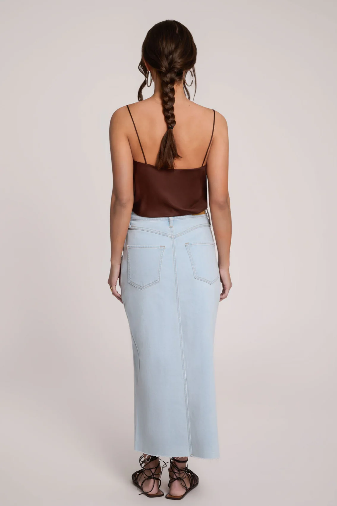 Rehaussez votre style avec notre jupe longue en jean trapèze. Dotée d’une coupe taille haute flatteuse, d’une fente sur le devant et d’un délavage bleu clair polyvalent, cette jupe est parfaite pour toutes les occasions. Des accessoires argentés, des coutures ton sur ton et un patch YJ en cuir végétalien ajoutent la touche parfaite de sophistication et de durabilité.
